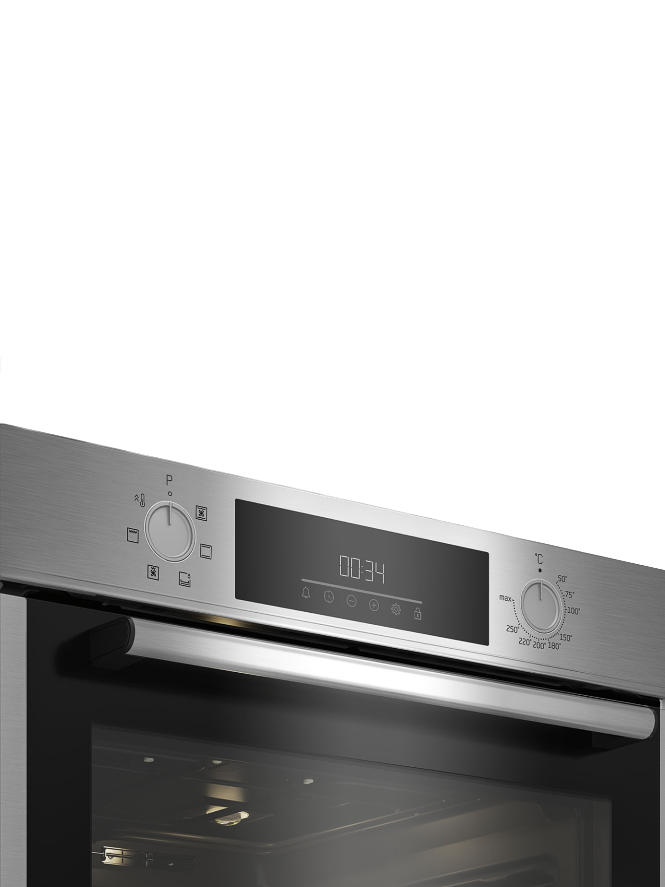 Каталитическое покрытие задней стенки камеры духового шкафа облегчает очистку, а тройное стекло дверцы обеспечивает безопасность использования.