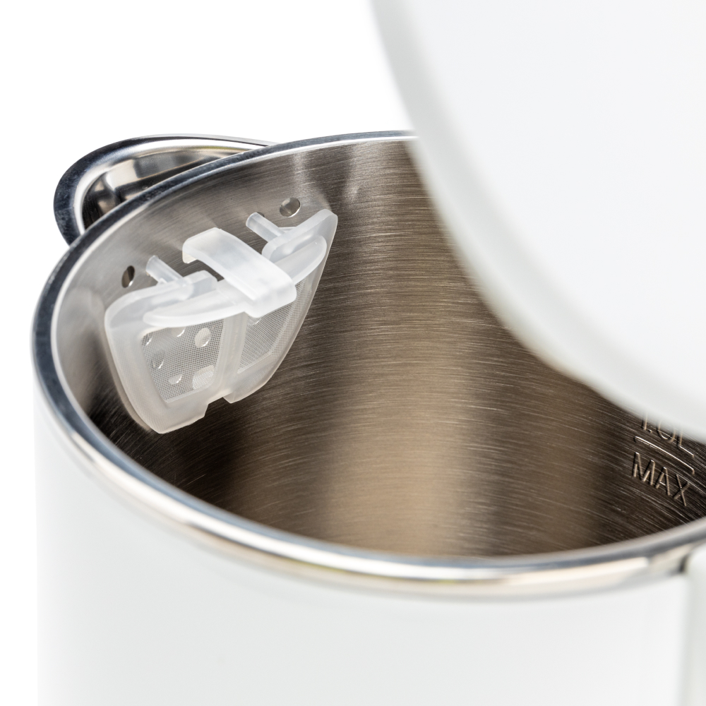Двухслойный корпус с теплоизоляцией эффективно сохраняет тепло, делает поверхность безопасной на ощупь и снижает шум при работе. Внутренняя часть из нержавеющей стали AISI 304 устойчива к коррозии и облегчает уход, а сетчатый фильтр защищает от накипи и примесей, обеспечивая чистоту воды.