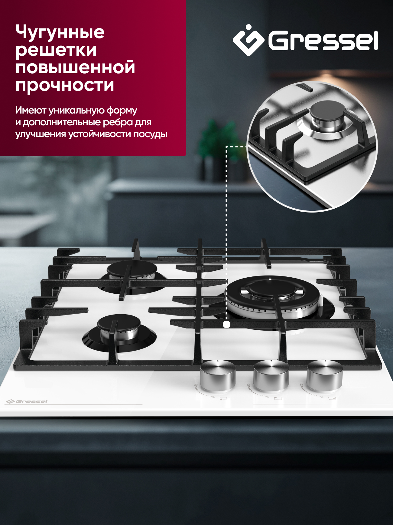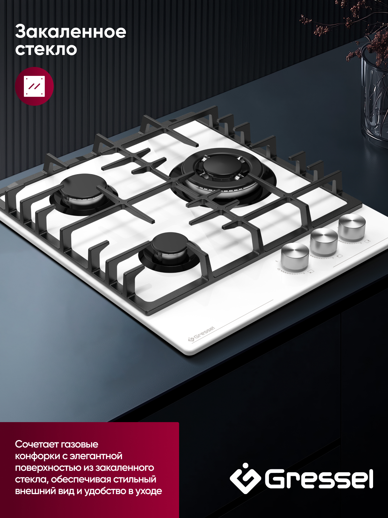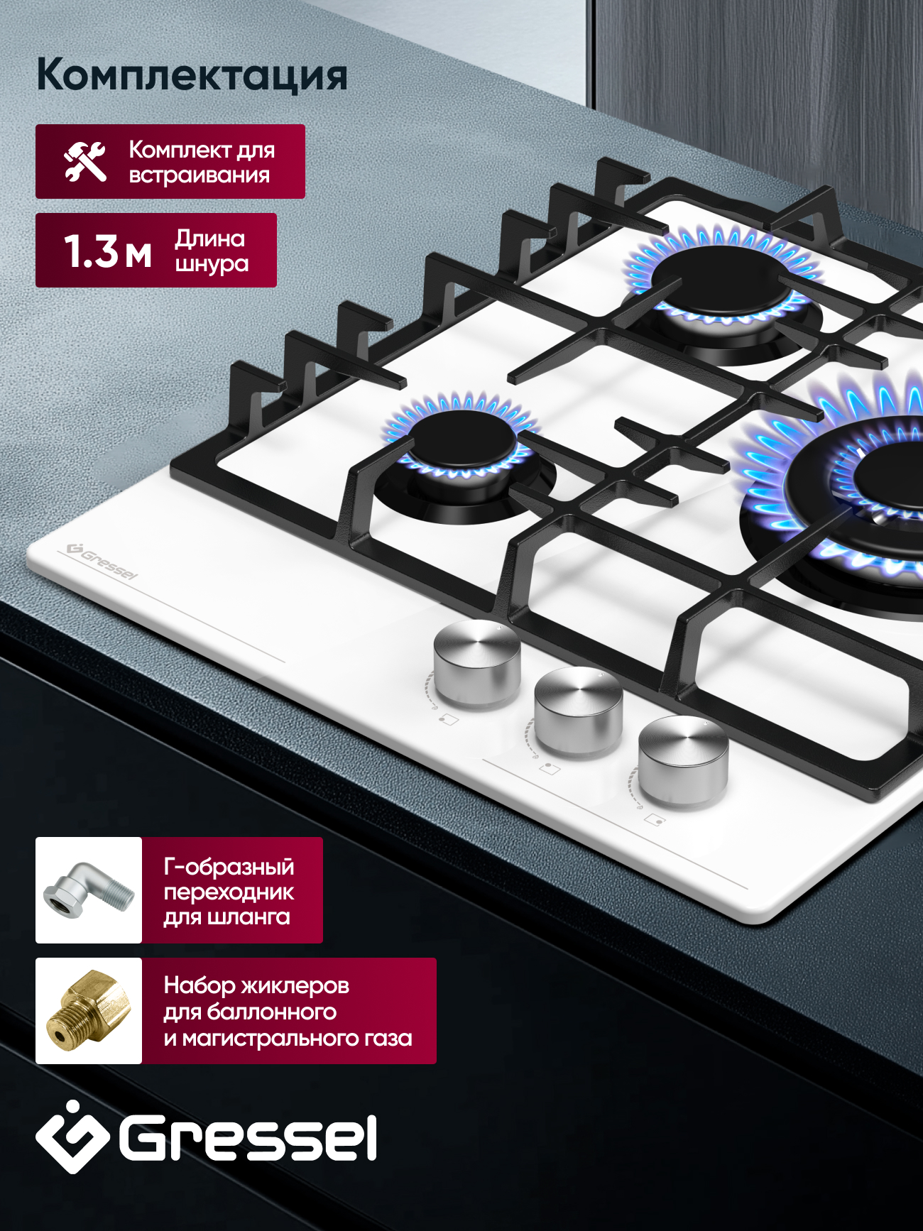 Варочная панель, инструкция, гарантийный талон, сертификат дополнительной гарантии, шнур питания, набор для крепления, набор жиклеров для балонного газа, форсунки для сжиженного нефтяного газа, газовый соединитель 90°C
