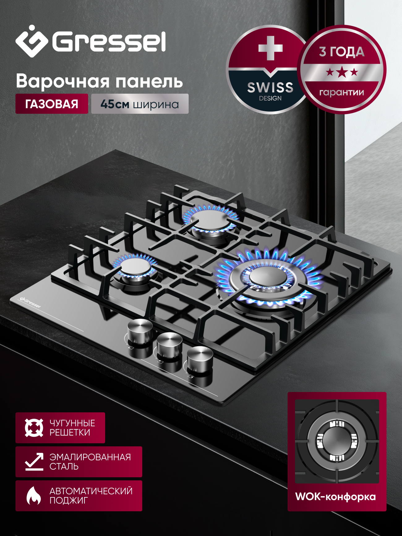 Варочная панель, инструкция, гарантийный талон, сертификат дополнительной гарантии, шнур питания, набор для крепления, набор жиклеров для балонного газа, форсунки для сжиженного нефтяного газа, газовый соединитель 90°C