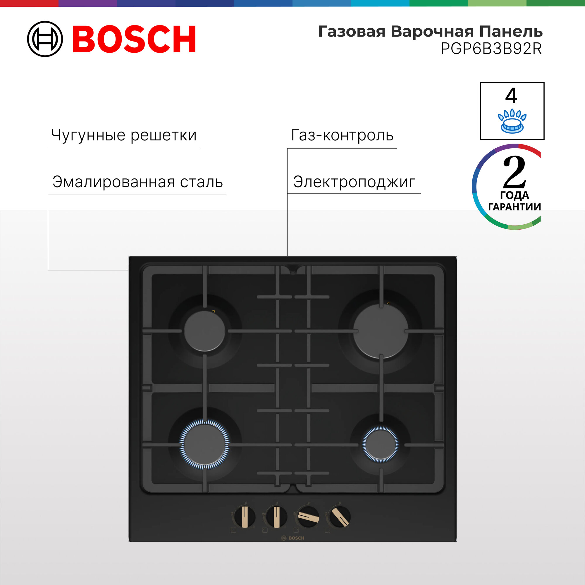 Страна производства: Испания. Товар новый в заводской упаковке. Варочная панель Bosch PGP6B3B92R в черном цвете оснащена автоматическим электроподжигом, что позволит не использовать спички и зажигалку. Поворотные переключатели просты и удобны в эксплуатации. Эмалированная поверхность легко отмывается от загрязнений. Чугунные решетки выдержат любой вес посуды.