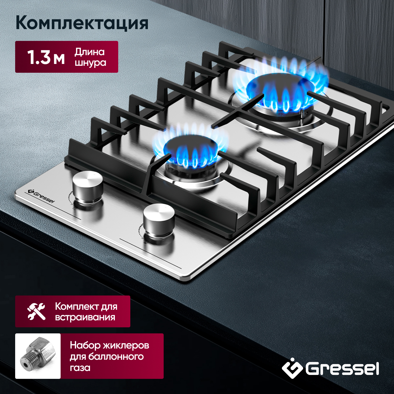 Комплектация: Включает комплект для встраивания, набор жиклеров для баллонного газа и шнур длиной 1,3 м.