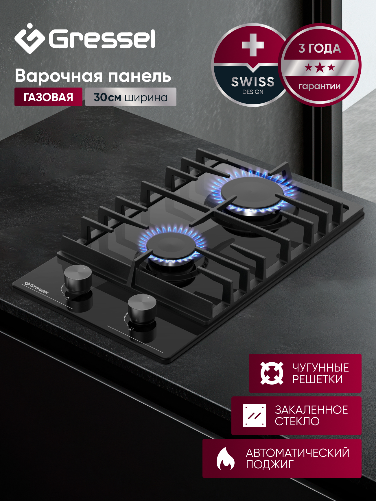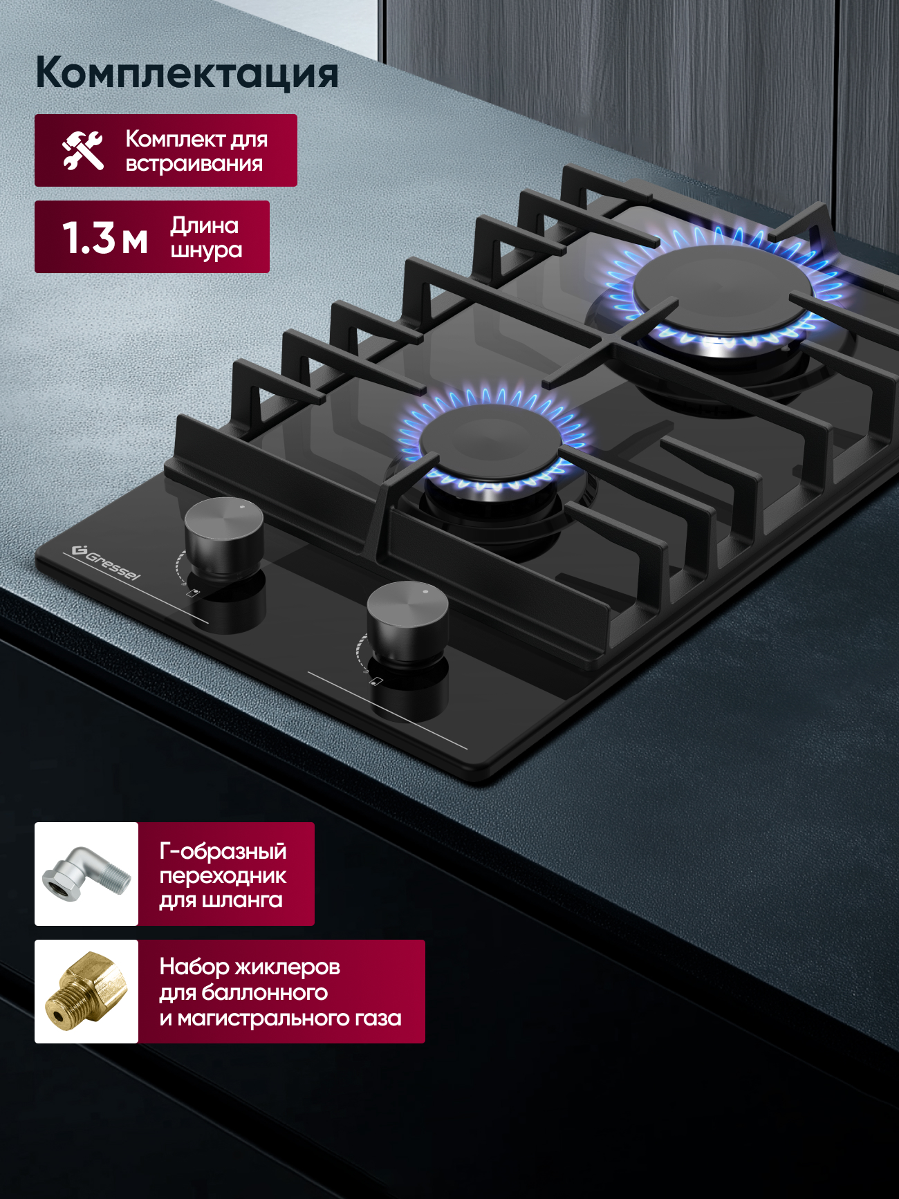 Варочная панель, инструкция, гарантийный талон, сертификат дополнительной гарантии, шнур питания, набор для крепления, набор жиклеров для балонного газа, форсунки для сжиженного нефтяного газа, газовый соединитель 90°C