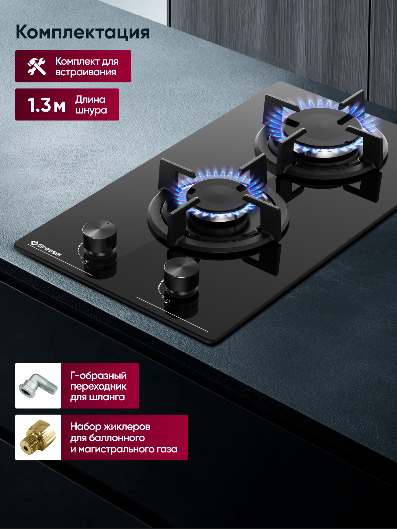 Варочная панель, инструкция, гарантийный талон, сертификат дополнительной гарантии, шнур питания, набор для крепления, набор жиклеров для балонного газа, форсунки для сжиженного нефтяного газа, газовый соединитель 90°C