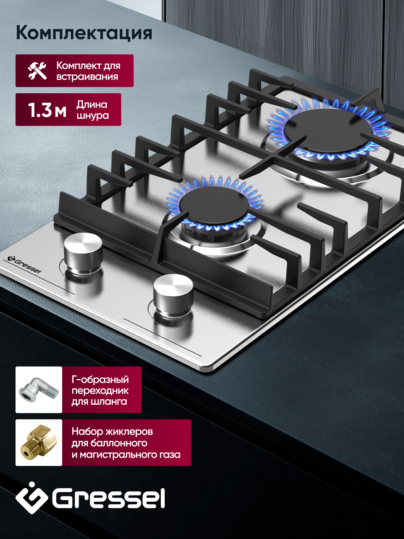 Варочная панель, инструкция, гарантийный талон, сертификат дополнительной гарантии, шнур питания, набор для крепления, набор жиклеров для балонного газа