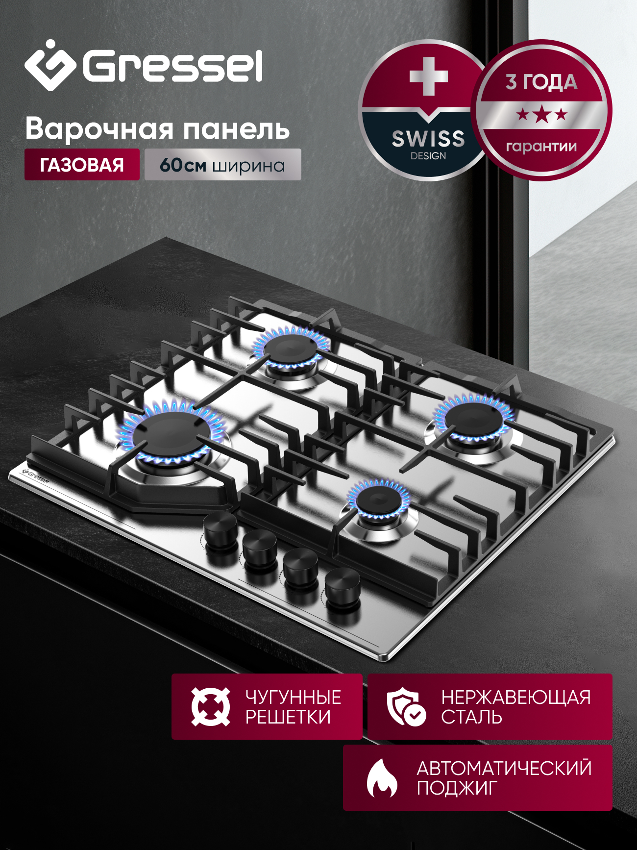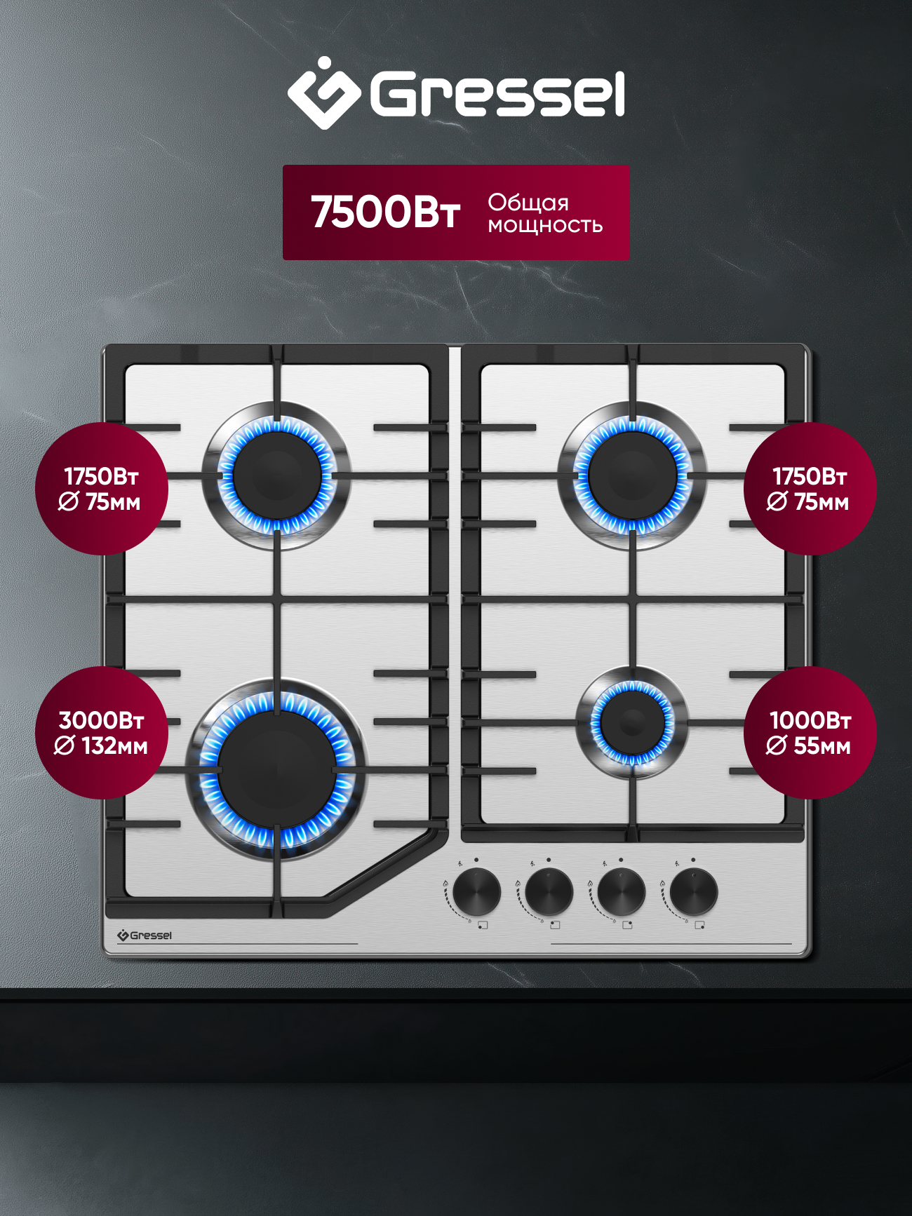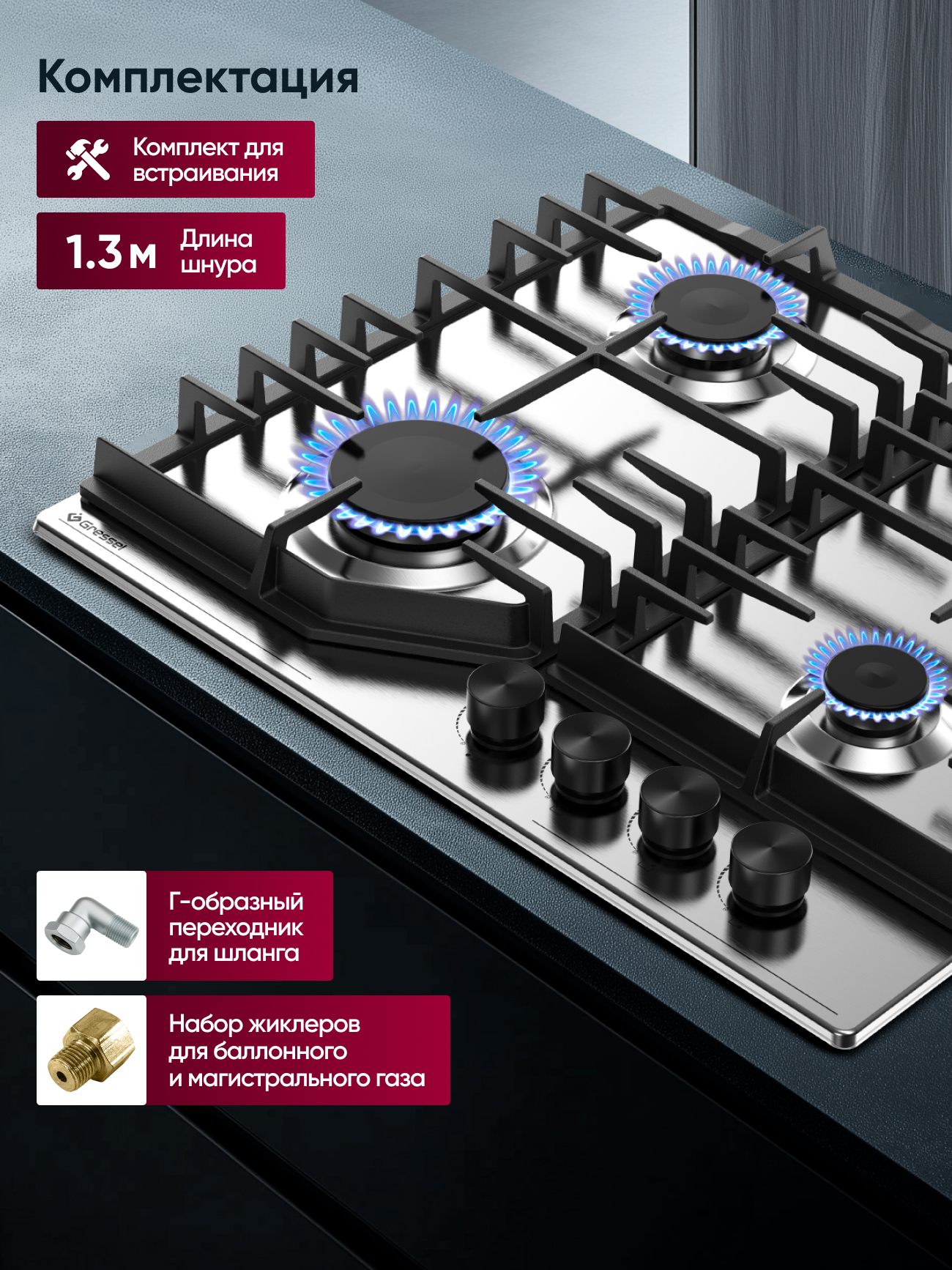 Варочная панель, инструкция, гарантийный талон, сертификат дополнительной гарантии, шнур питания, набор для крепления, набор жиклеров для балонного газа, форсунки для сжиженного нефтяного газа, газовый соединитель 90°C