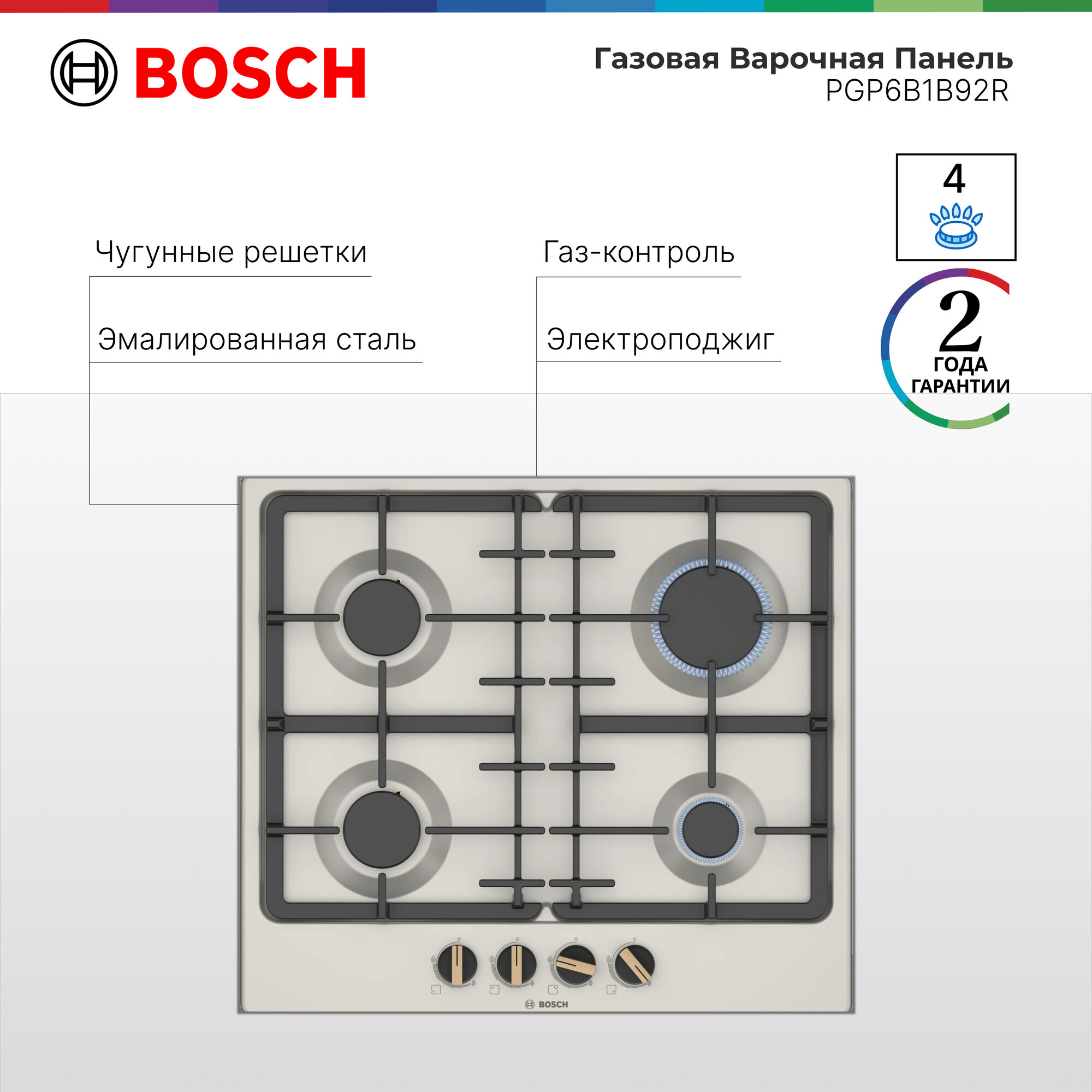 Страна производства: Испания. Товар новый в заводской упаковке. Варочная панель Bosch PGP6B1B92R выполнена в жемчужном цвете с эмалированной поверхностью. Чугунные решетки выдерживают перепады температур и тяжелую посуду, что гарантирует длительную эксплуатацию. Газ-контроль обеспечит безопасность при использовании: подача газа прекратится, если пламя случайно погаснет.