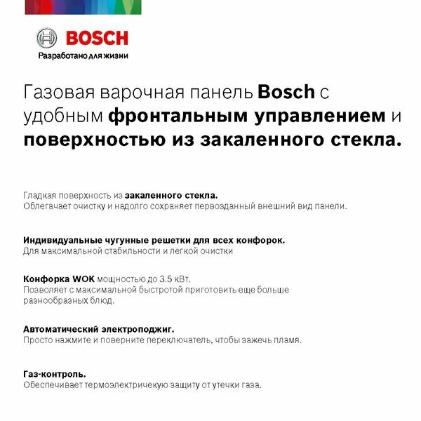 Страна производства: Испания. Товар новый в заводской упаковке. Варочная панель Bosch PNH6B6092R привлекает внимание стильным дизайном, мощными конфорками, простой и безопасной работой. В удобные поворотные рычаги встроен автоматический электроподжиг, не требующий спичек при включении конфорки.