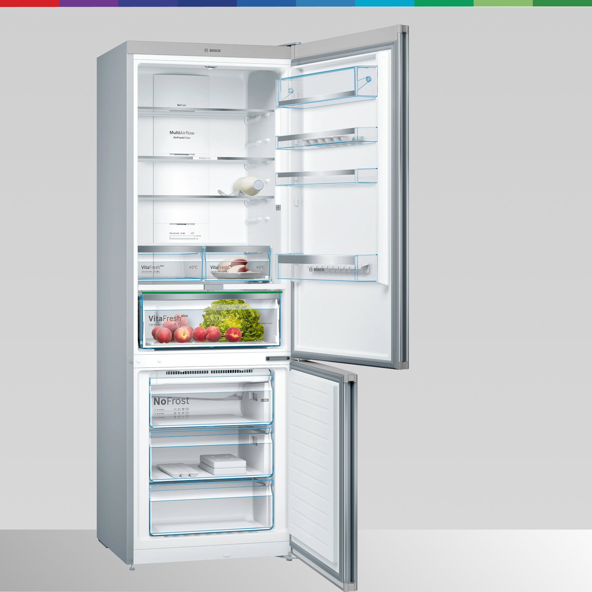 • 4 дверных отделения, из которых одно отделение для молочных продуктов и одно высокое отделение для бутылок
