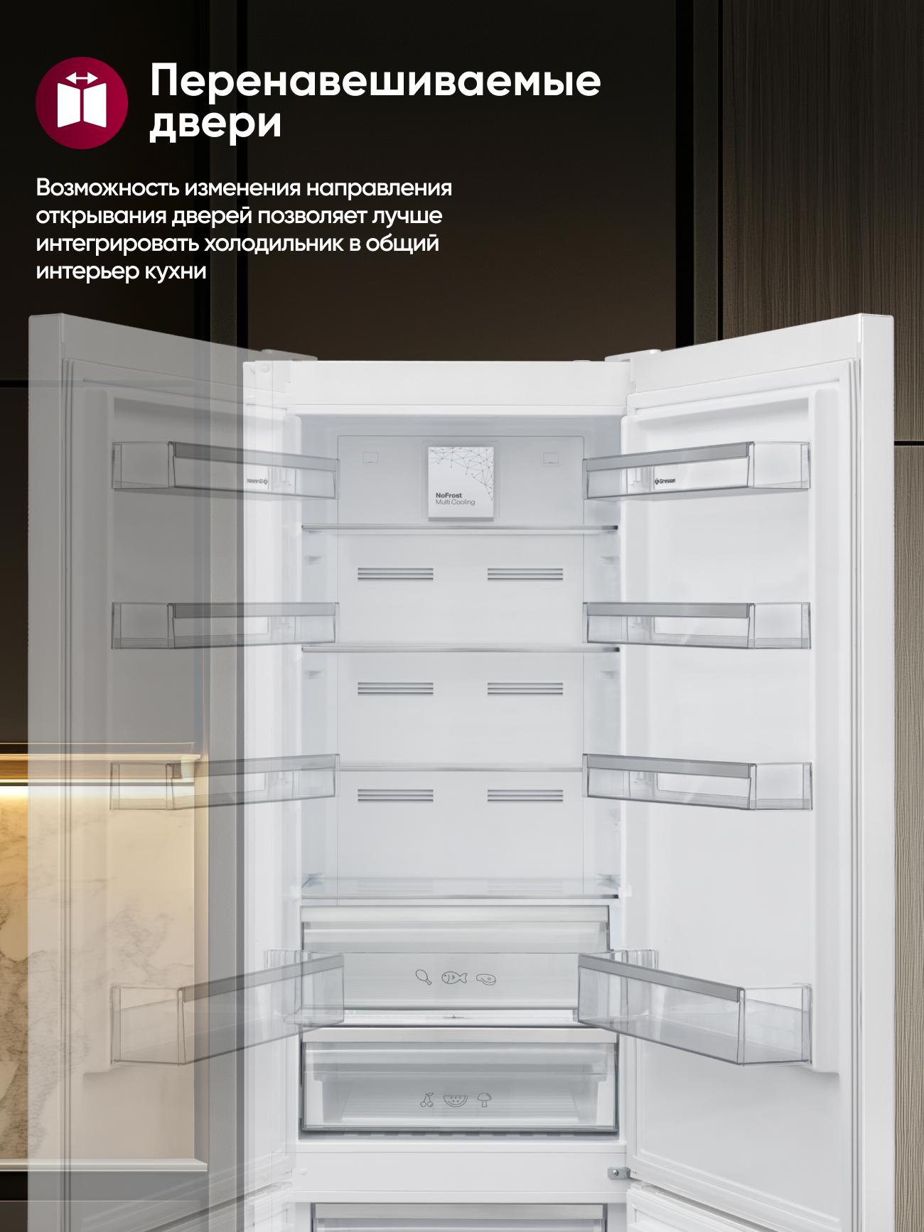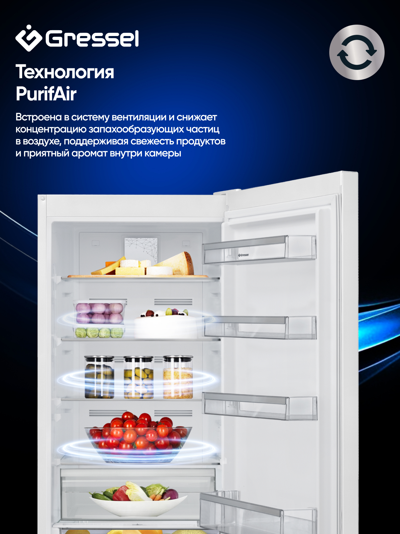 Безопасность и надёжность обеспечены системой сигнализации открытой дверцы и индикацией «Предупреждение о неисправности». Внутреннее пространство организовано с заботой о пользователях: регулируемые полки, зона свежести, отделение для фруктов и овощей, отсек для яиц и лоток для льда. Особая технология PurifAir нейтрализует неприятные запахи, сохраняя воздух внутри чистым и свежим.