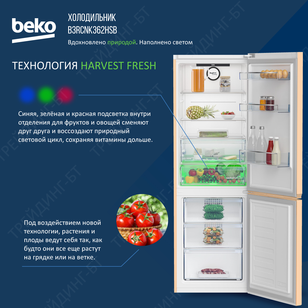 Холод. отд.: Зона свежести 0-3˚C , LED освещение, 2 ящика, 2 регулируемые полки из закаленного стекла, 3 дверные полки, подставка для яиц. Мороз. отд.: 3 отделения, поддон для ягод Ice Bank