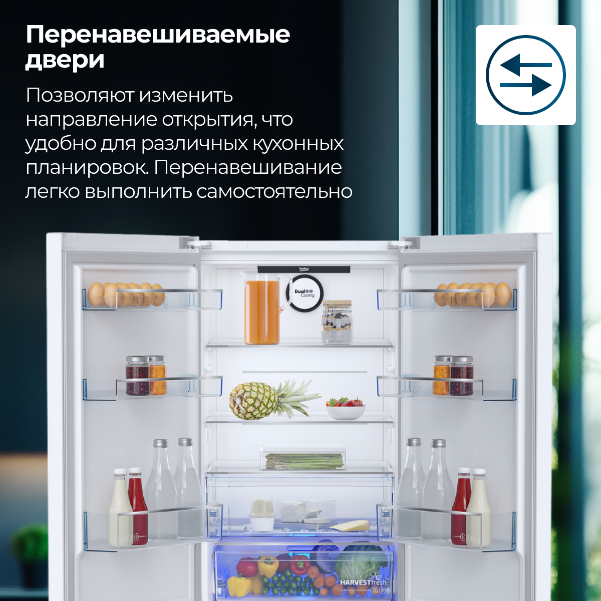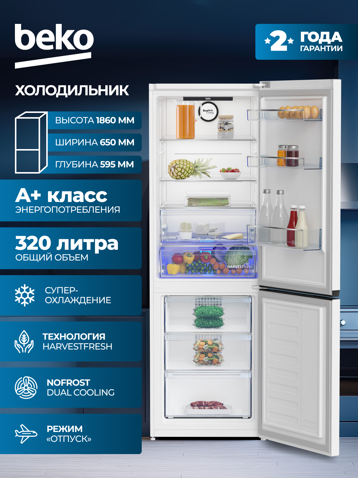 Двухконтурная система охлаждения No Frost Dual Cooling, Режим "Отпуск", МОРОЗ.ОТД: быстрое замораживание Quick Freeze, Режим экономии энергии