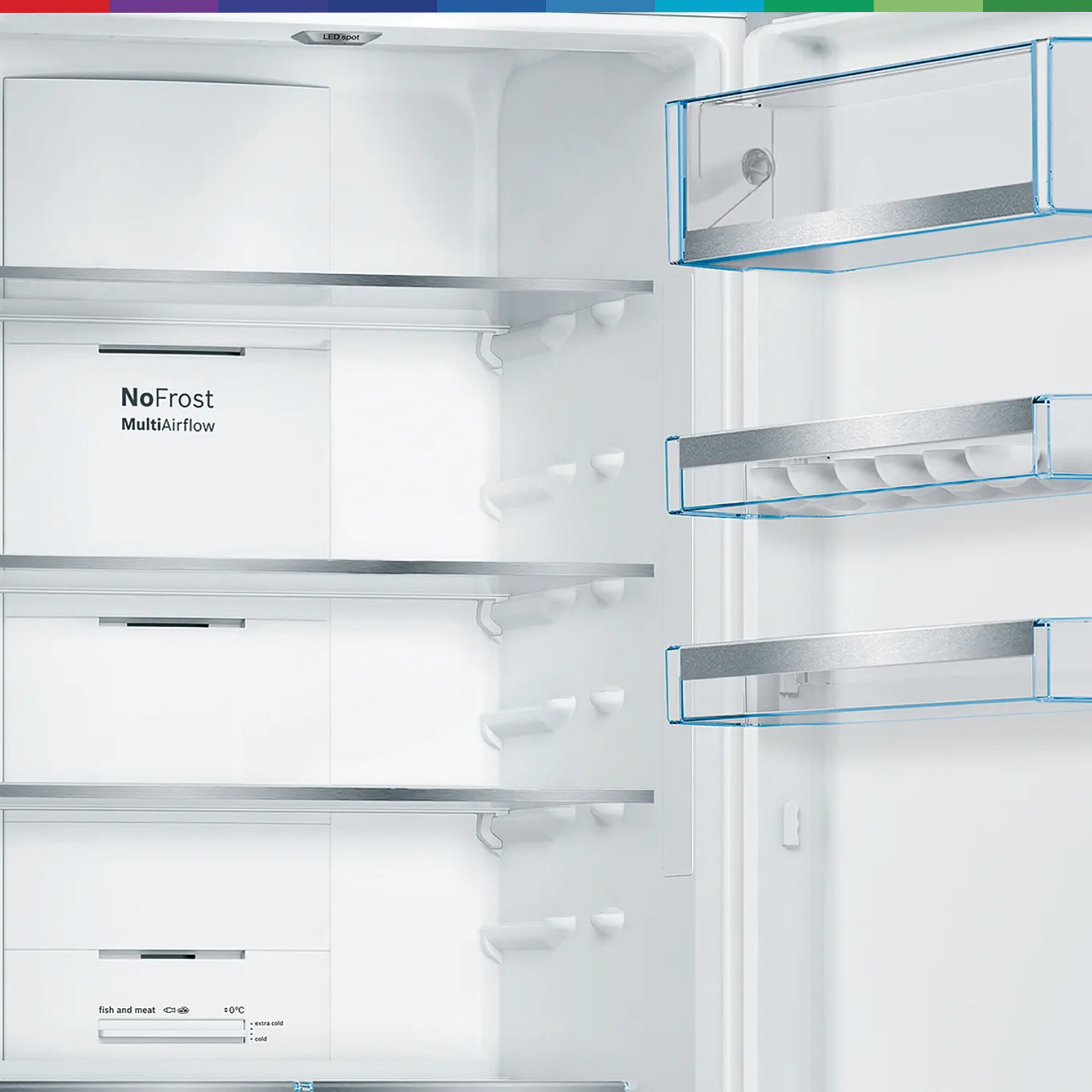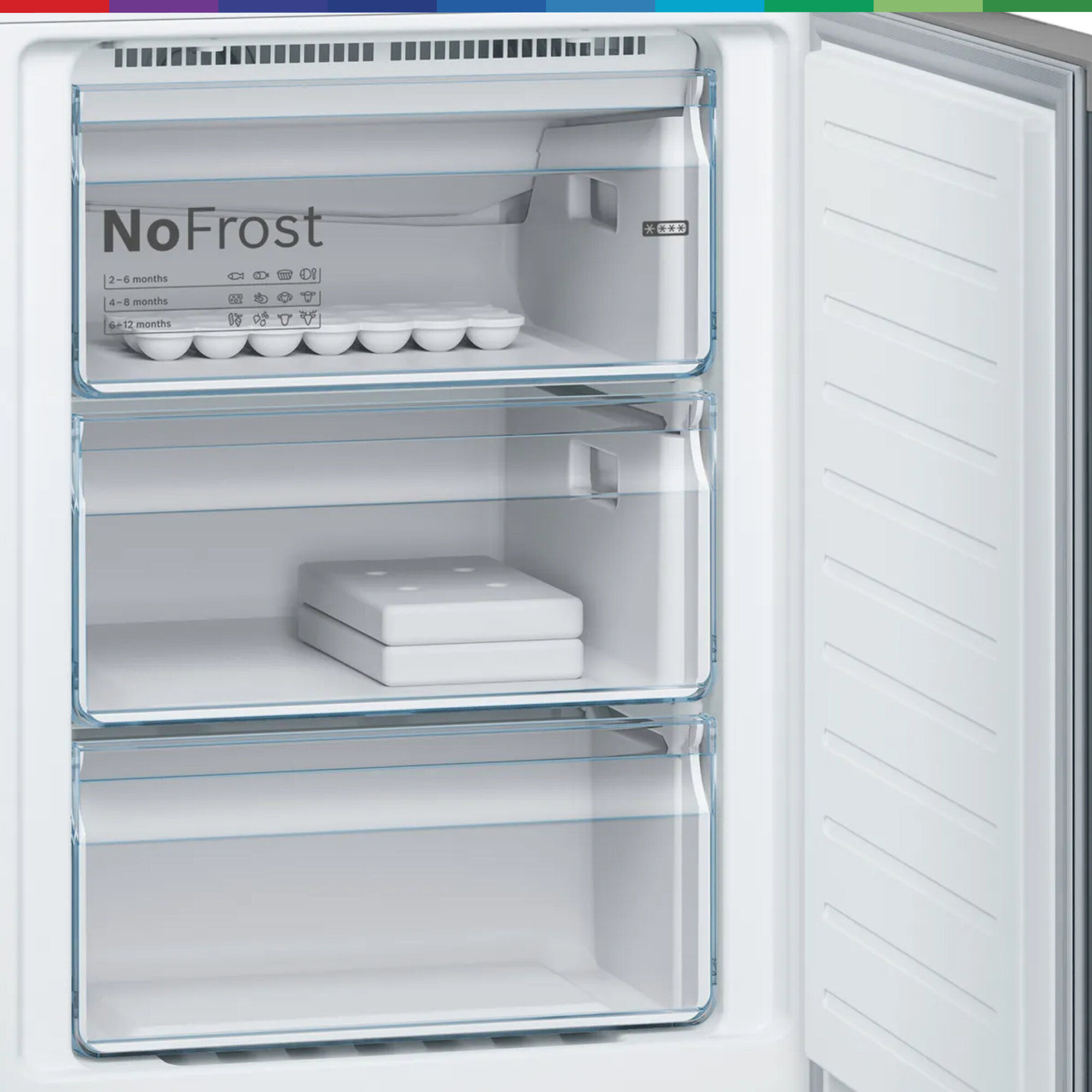 И холодильные, и морозильные камеры холодильников Bosch оборудованы системой «NoFrost» (пер. с англ. «Без мороза»). Это система принудительной циркуляции воздуха, препятствующая осаждению на холодных поверхностях влаги с последующей ее кристаллизацией — превращением в иней. Такие холодильники не требуют периодического размораживания. При этом подразумевается, что холодильник эксплуатируется в нормальном режиме. Если же дверцу агрегата подолгу держать распахнутой при каждом открытии, испаритель все-таки может обледенеть. В таком случае автоматического оттаивания может оказаться недостаточно.