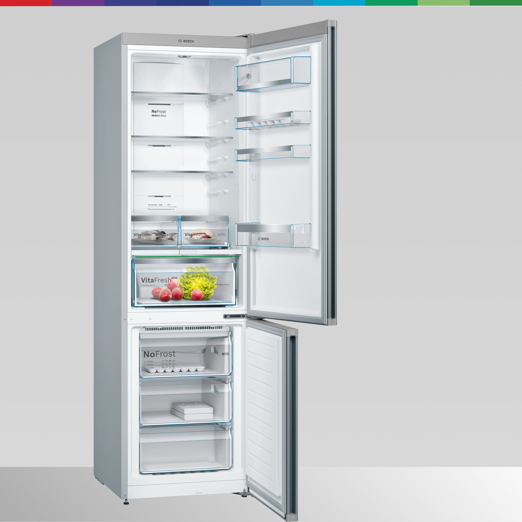 Зона свежести в инструкциях к холодильникам Bosch так же может именоваться как «Отделение VitaFresh». Охлаждение продуктов происходит быстрее благодаря направленному потоку холодного воздуха. Разные модели комплектуются одним или несколькими ящиками. В низкотемпературной зоне (около 0°C) можно хранить рыбу и мясо. Большой контейнер предназначен для хранения фруктов и овощей. Можно установить один из двух уровней влажности для более оптимального сохранения витаминов.