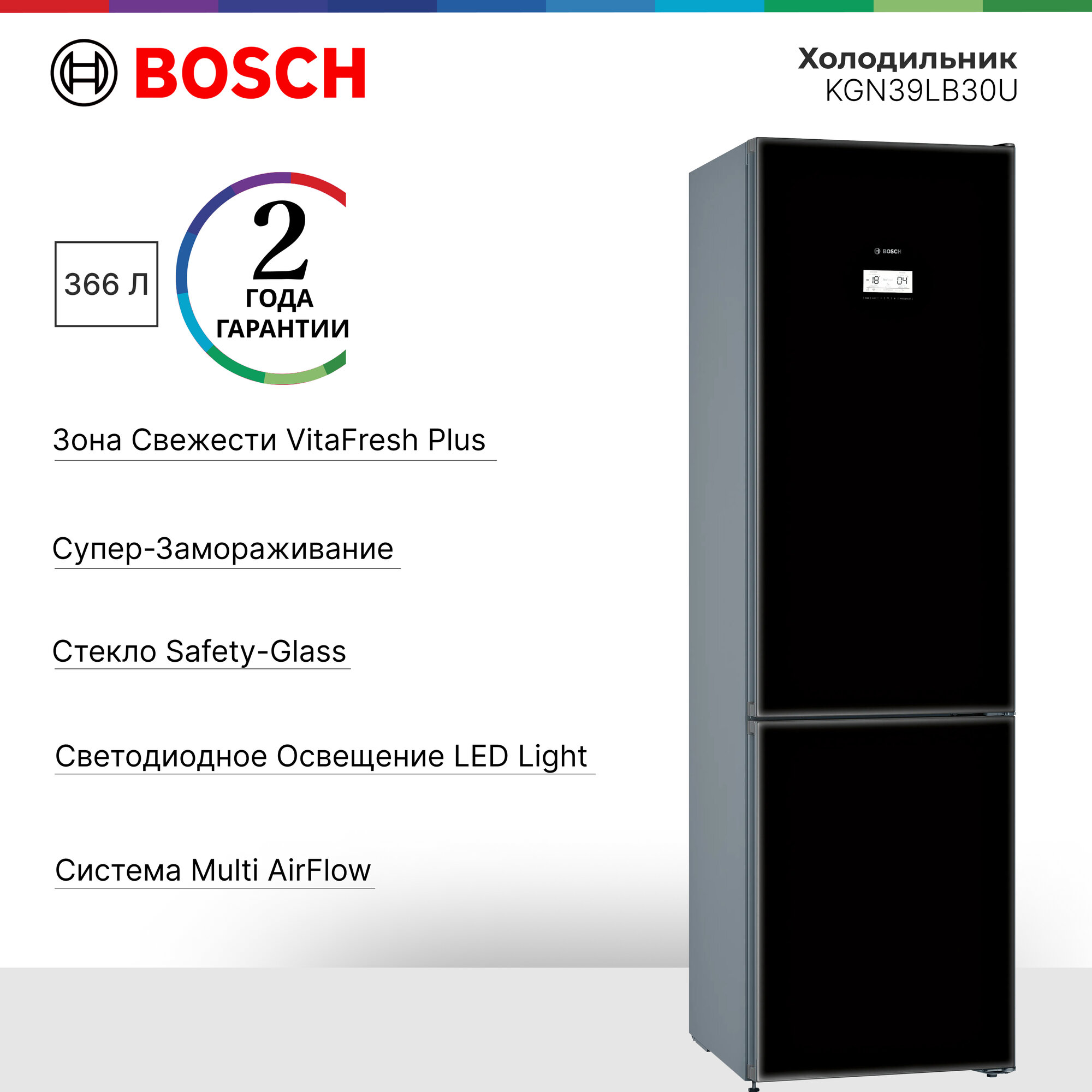 Холодильник Bosch KGN39LB30U Serie 6, нулевой зазор, 400 л, Home Connect, SuperFreezing, VitaFresh, No Frost, с дисплеем