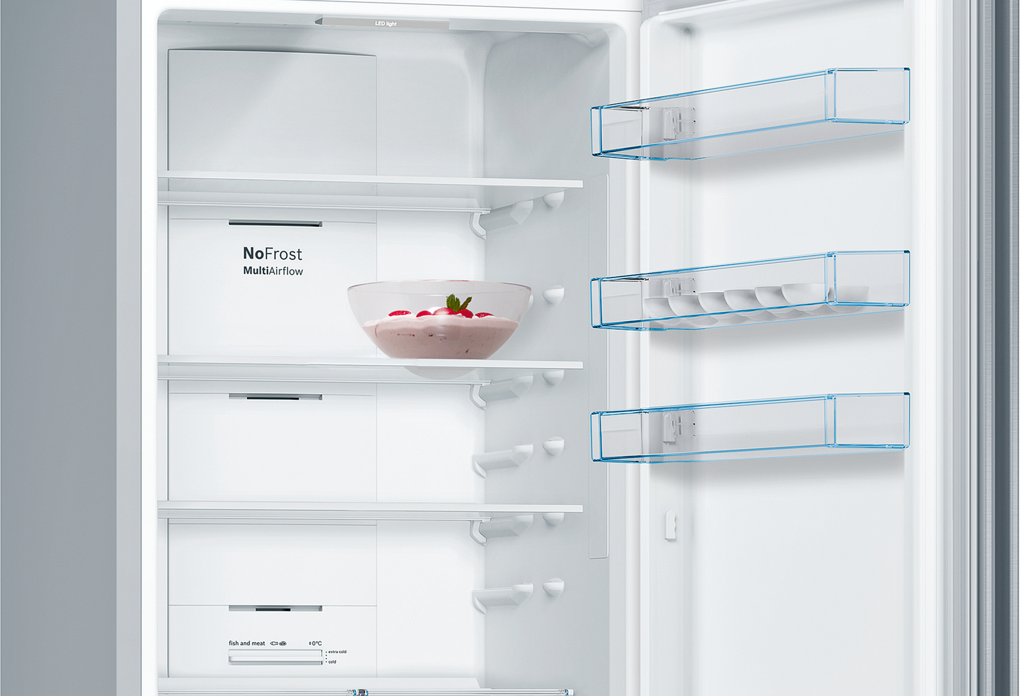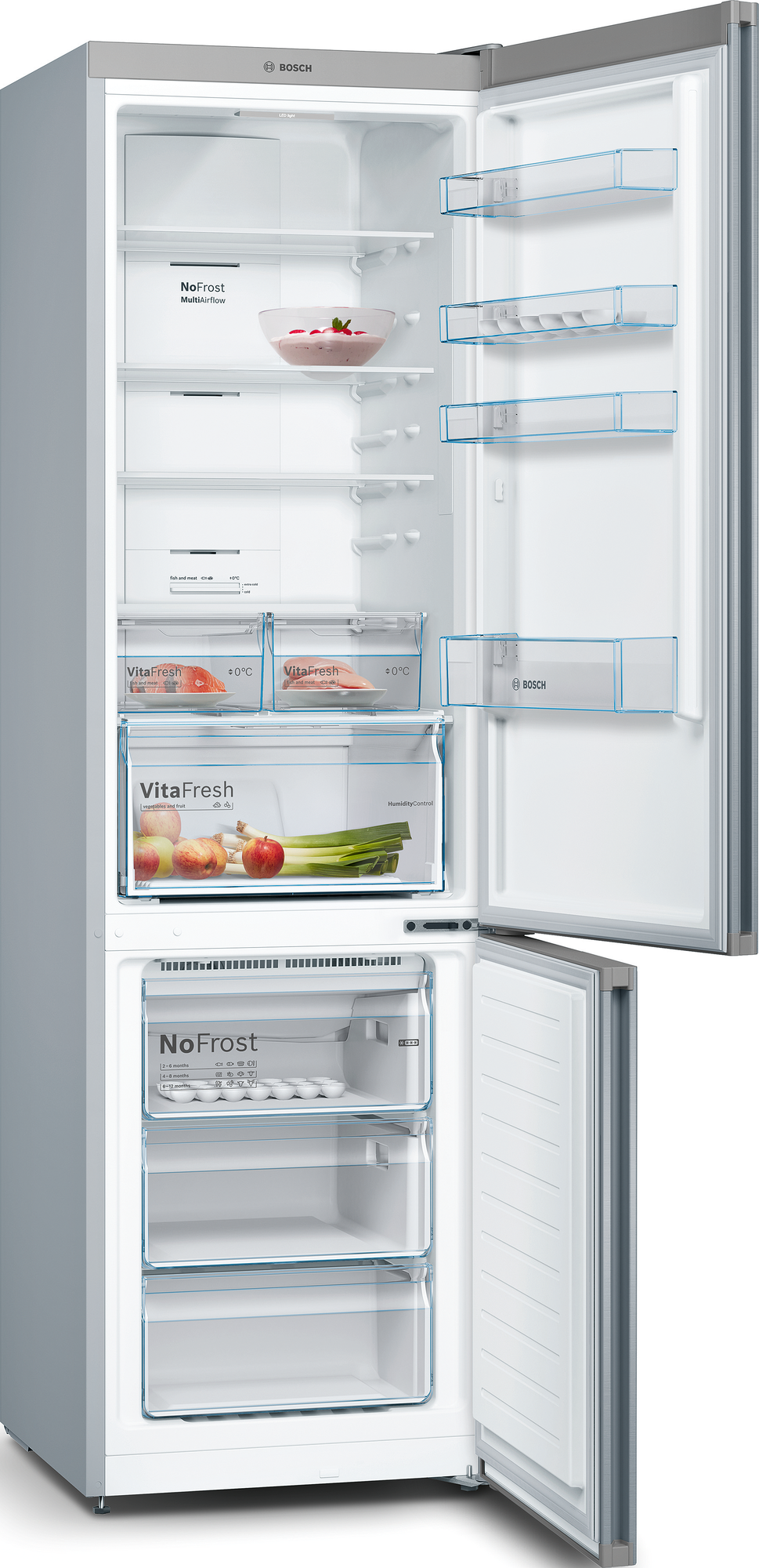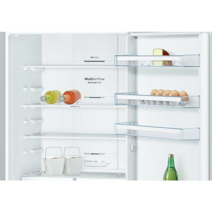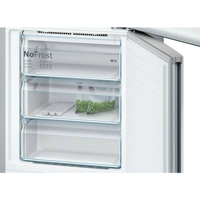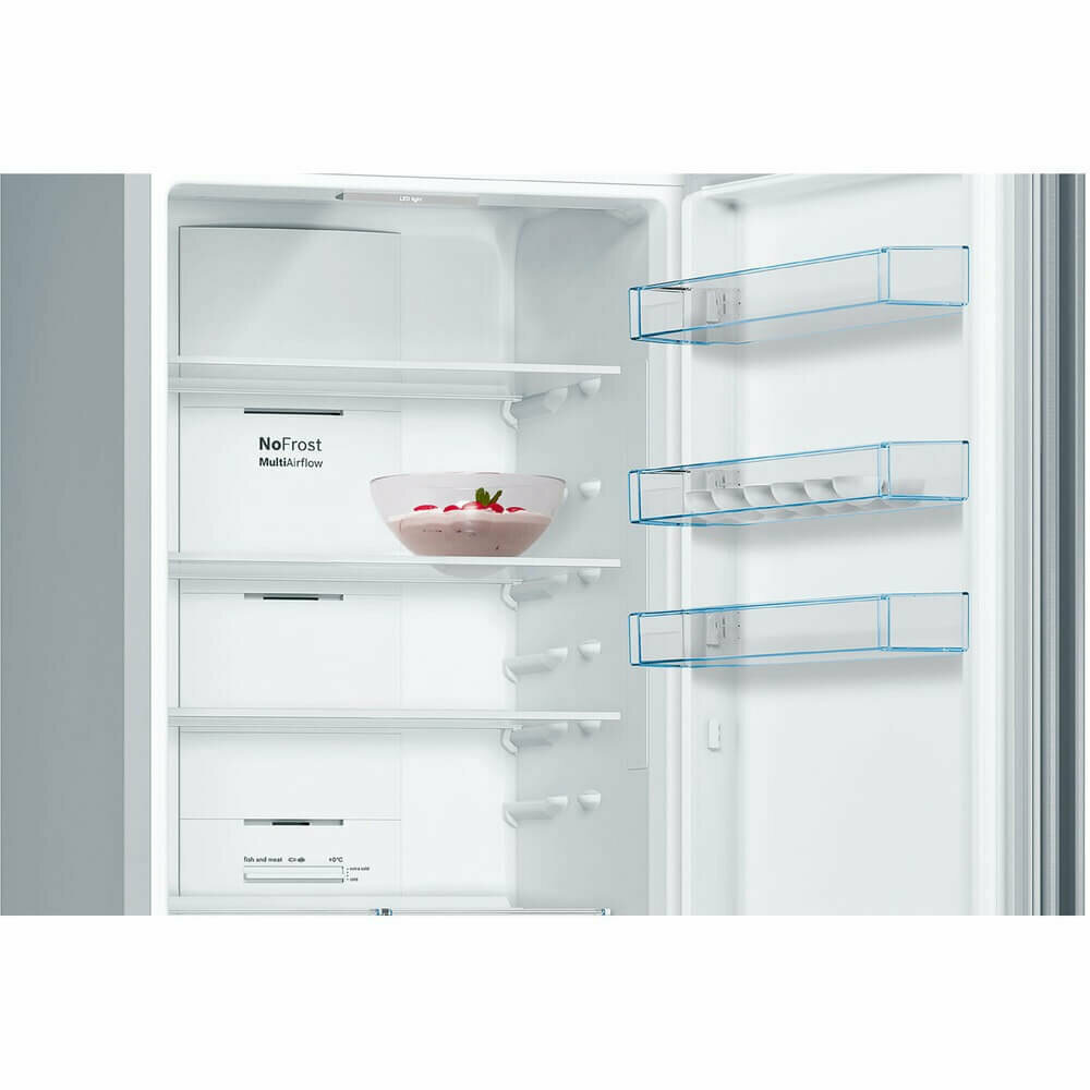 Страна производства: Турция. Товар новый в заводской упаковке. Двухкамерный холодильник Bosch KGN39XI30UЗона VitaFresh с волнистым дном и настройкой влажности поможет сохранить свежесть овощей и фруктов, например, зеленого лука и клубники, надолго. Фильтр Airfresh с антибактериальной защитой antiBacteria, встроенный в систему вентиляции, нейтрализует запахи внутри холодильника, чтобы продукты сохраняли свой естественный аромат и вкус.Ключевые преимущества:Покрытие против отпечатков пальцевЗона VitaFreshАнтибактериальный фильтр AirfreshОБЩИЕ ХАРАКТЕРИСТИКИТип отдельностоящийВид холодильник с морозильникомРасположение морозильной камеры снизуКоличество камер 2Функция FreshSense естьВМЕСТИМОСТЬОбщий полезный объем, л 366Полезный объем холодильной камеры, л 279Полезный объем морозильной камеры, л 87ДИЗАЙНСерия Serie | 4Цвет нержавеющая стальОбработка против отпечатков пальцев естьУПРАВЛЕНИЕЭлементы управления сенсорныеДисплей естьХОЛОДИЛЬНАЯ КАМЕРАСистема охлаждения х.к. No FrostСистема размораживания х.к. автоматическаяСистема MultiAirflow естьФункция суперохлаждения естьОБОРУДОВАНИЕ ХОЛОДИЛЬНОЙ КАМЕРЫОбщее количество полок в холодильной камере 4Количество регулируемых полок в холодильной камере 3Количество фиксированных полок в холодильной камере 1Полки из высокопрочного стекла естьВыдвижные полки EasyAccess естьКоличество полок на дверце 4Количество подставок для яиц 1Внутреннее освещение холодильной камеры светодиодноеЗОНА СВЕЖЕСТИЗона свежести естьТип зоны свежести VitaFresh 0°СМОРОЗИЛЬНАЯ КАМЕРАМощность морозильной камеры ****Система размораживания м.к. автоматическаяСистема охлаждения м.к. NoFrostМощность замораживания, кг/ 24 ч 15Автономное сохранение холода, ч 16Функция суперзамораживание SuperFreezing естьОБОРУДОВАНИЕ МОРОЗИЛЬНОЙ КАМЕРЫКоличество ящиков в морозильной камере 3Количество ванночек для льда 1ТЕХНИЧЕСКИЕ ХАРАКТЕРИСТИКИКласс энергопотребления E (старое обозначение A++)Количество компрессоров 1Тип компрессора стандартныйКоличество контуров охлаждения 1Годовой расход эл.энергии, кВтч 347Мощность подключения, Вт 100Напряжение, В 220-240Частота тока, Гц 50-60Предохранители, А 10Уровень шума, дб 39БЕЗОПАСНОСТЬИндикация открытой двери звуковаяСигнализация об ошибке световая и звуковаяГАБАРИТЫ, ВЕСВысота, см 203Ширина, см 60Глубина, см 66Вес нетто, кг 75.5КОНСТРУКЦИЯРучка двери встроенная вертикальнаяДверной упор справаВозможность перенавешивания двери естьФильтр Airfresh естьДОПОЛНИТЕЛЬНЫЕ ХАРАКТЕРИСТИКИДлина сетевого кабеля, м 1.75Календарь хранения продуктов естьВозможность установки вплотную к стене есть