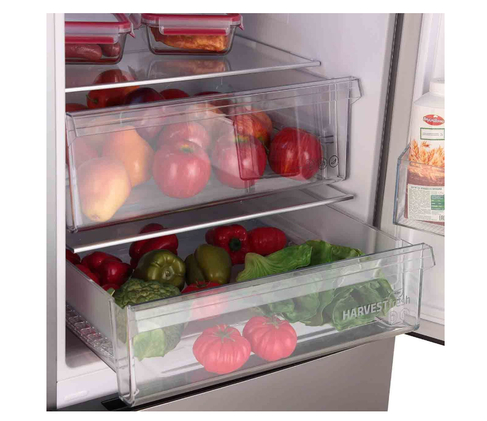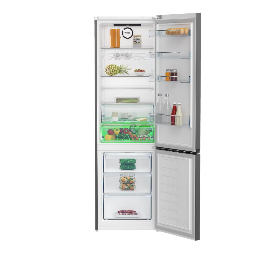 Холодильник Beko B3RCNK402HX на 257 л оснащен красивыми стеклянными полками, подставками для яиц и бутылок, отдельной зоной свежести. Расположенный снизу морозильный шкаф оснащен выдвижными ящиками с общим объемом 100 л. Предусмотрена уникальная технология HarvestFresh, имитирующая световой суточный цикл, которая помогает лучше сохранить витамины в продуктах.