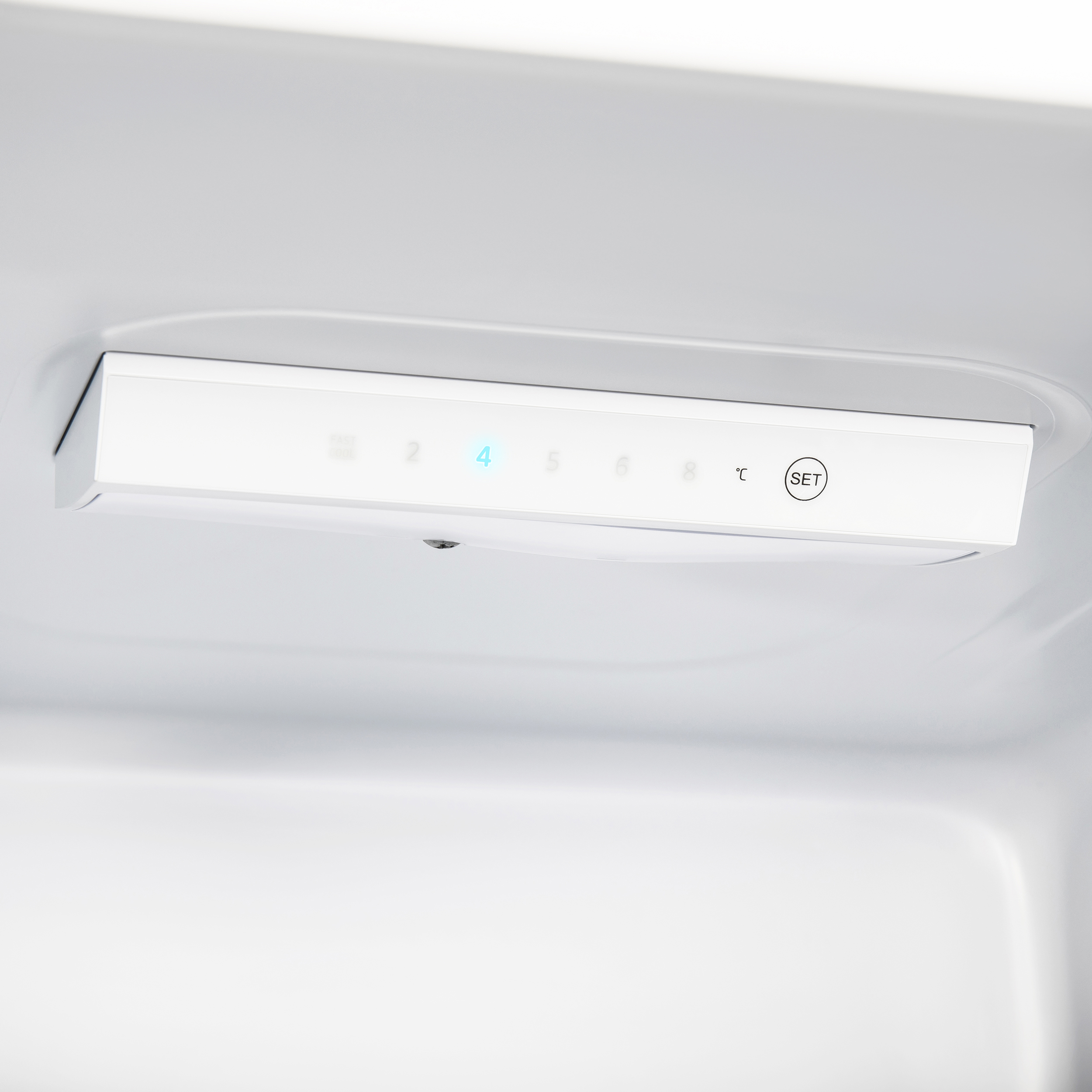 Управление сенсорное. Кнопки включения/выключения, выбора температуры (+2°C до +8°C) и быстрого охлаждения находятся на дисплее в верхней части холодильника.