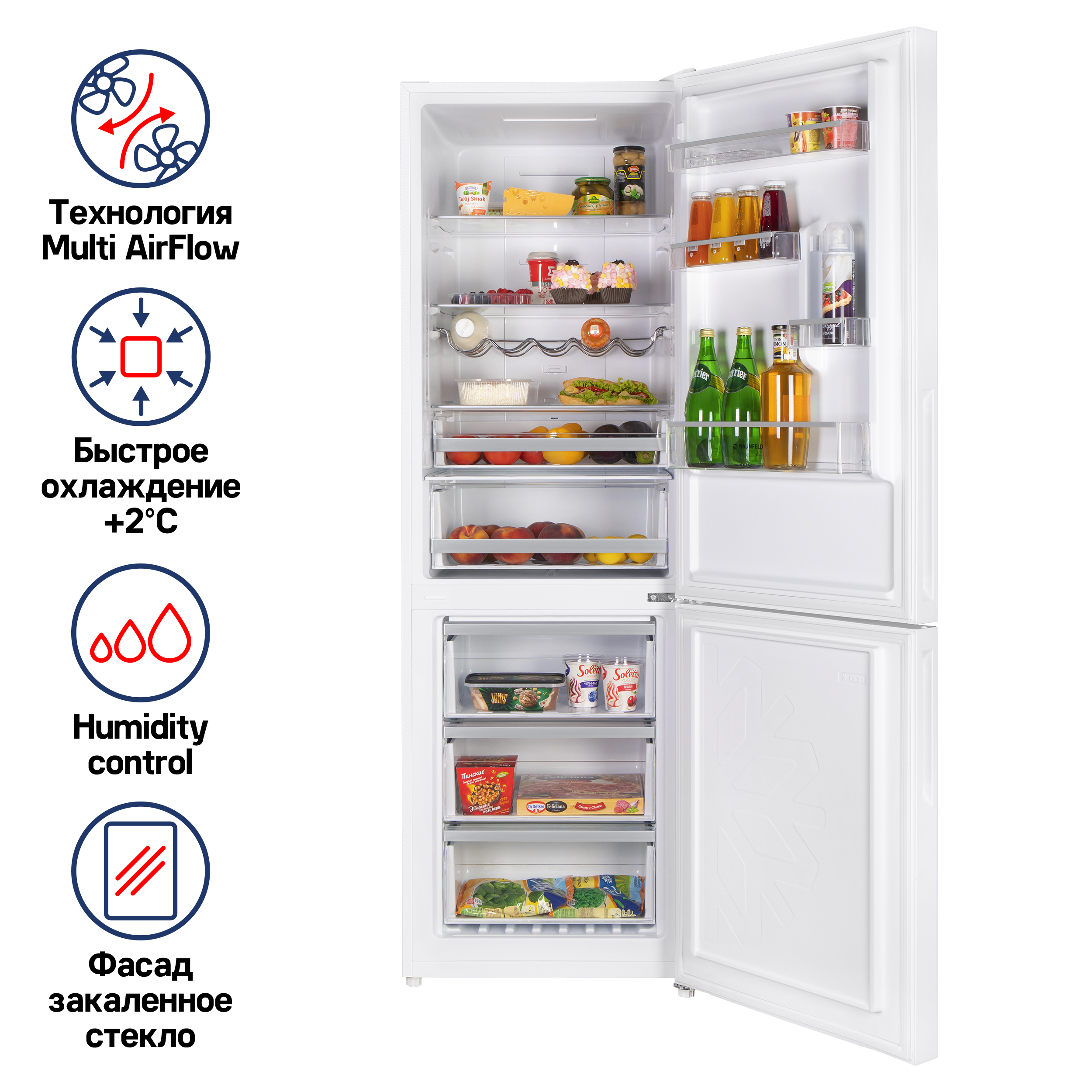 Современная система охлаждения обеих камер NO FROST не даст образоваться инею и льду на стенках холодильника. Благодаря постоянной циркуляции холодного воздуха в холодильном и морозильном отделении создаются оптимальные условия хранения продуктов. Система многопоточного охлаждения Multi Air Flow