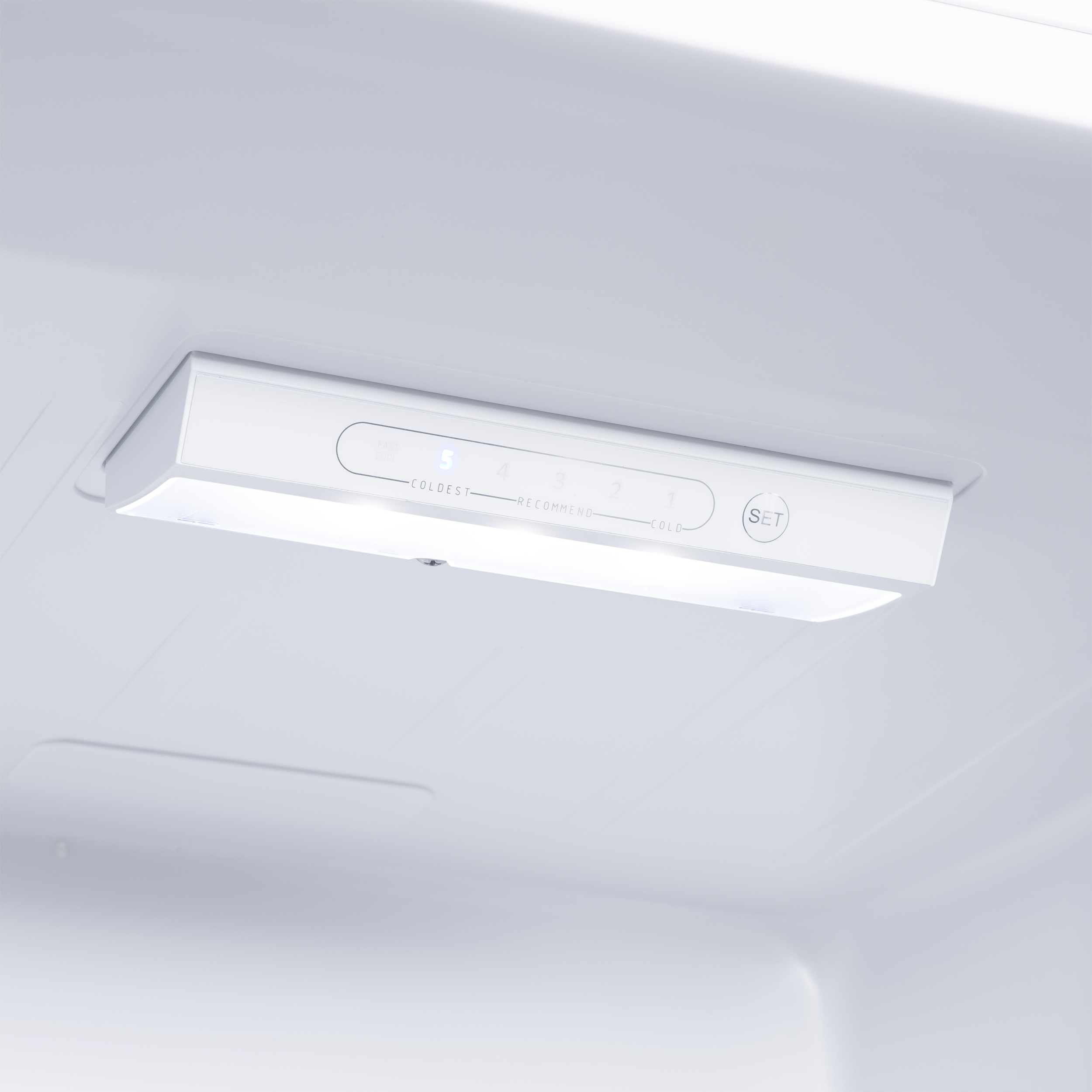 Кнопки выбора температуры (+2°C до +8°C) и быстрого охлаждения морозильной камеры находятся на дисплее в верхней части холодильника.