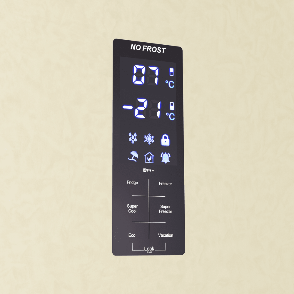 Современный двухкамерный холодильник с сенсорным управлением.