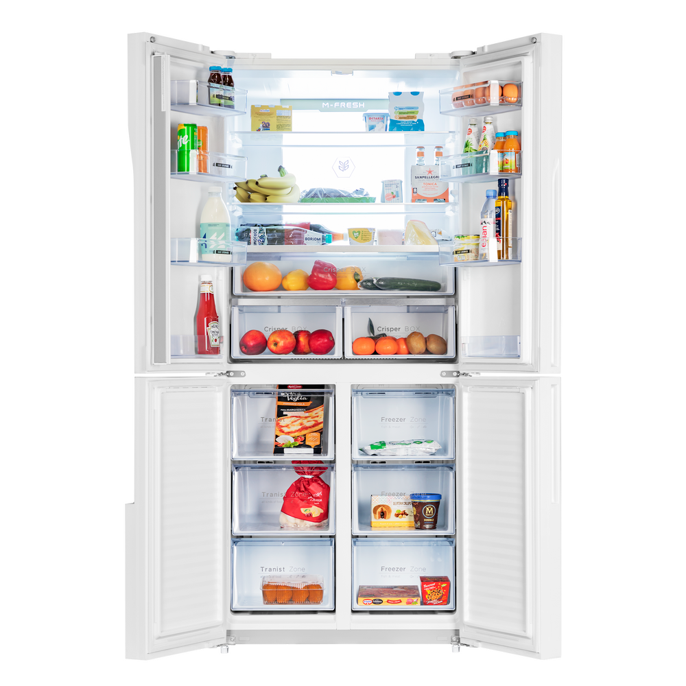 Холодильник высотой 181 см имеет ширину 78 см и сделан из металла. Две верхние и две нижние двери укомплектованы стеклянными фасадами также белого цвета. Внутренняя часть выполнена из антибактериального белого пластика легкой очистки.