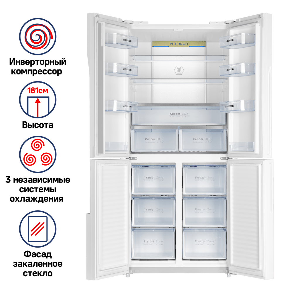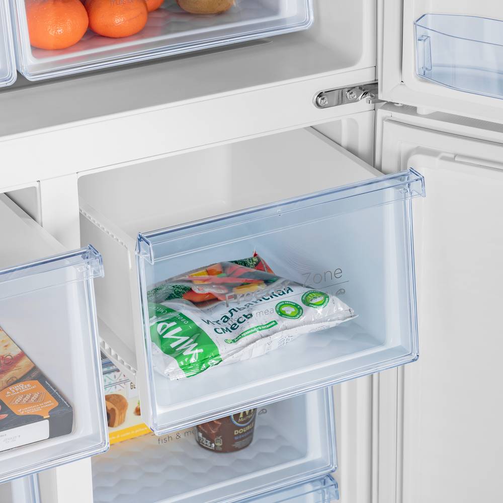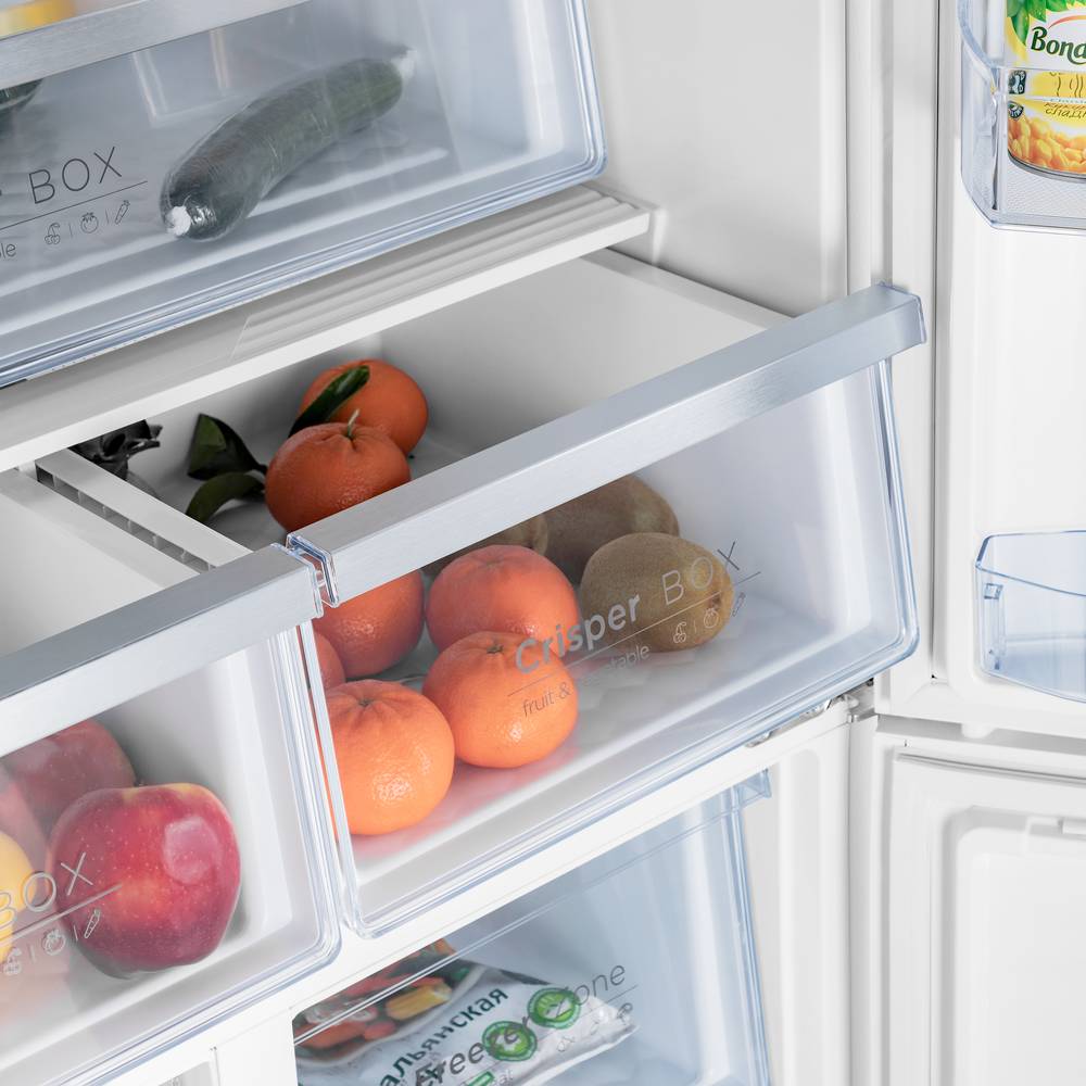 Система охлаждения всех трех камер - «Total No Frost». Это инновационная разработка, при которой холодный сухой воздух равномерно распределяется при помощи вентилятора по всей камере. Благодаря этому на продуктах и внутренних поверхностях прибора не образовывается иней. Теперь вам никогда не придется размораживать холодильник.