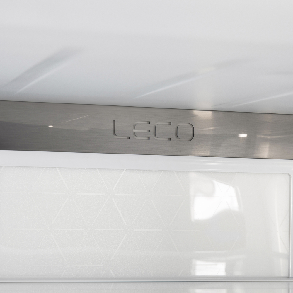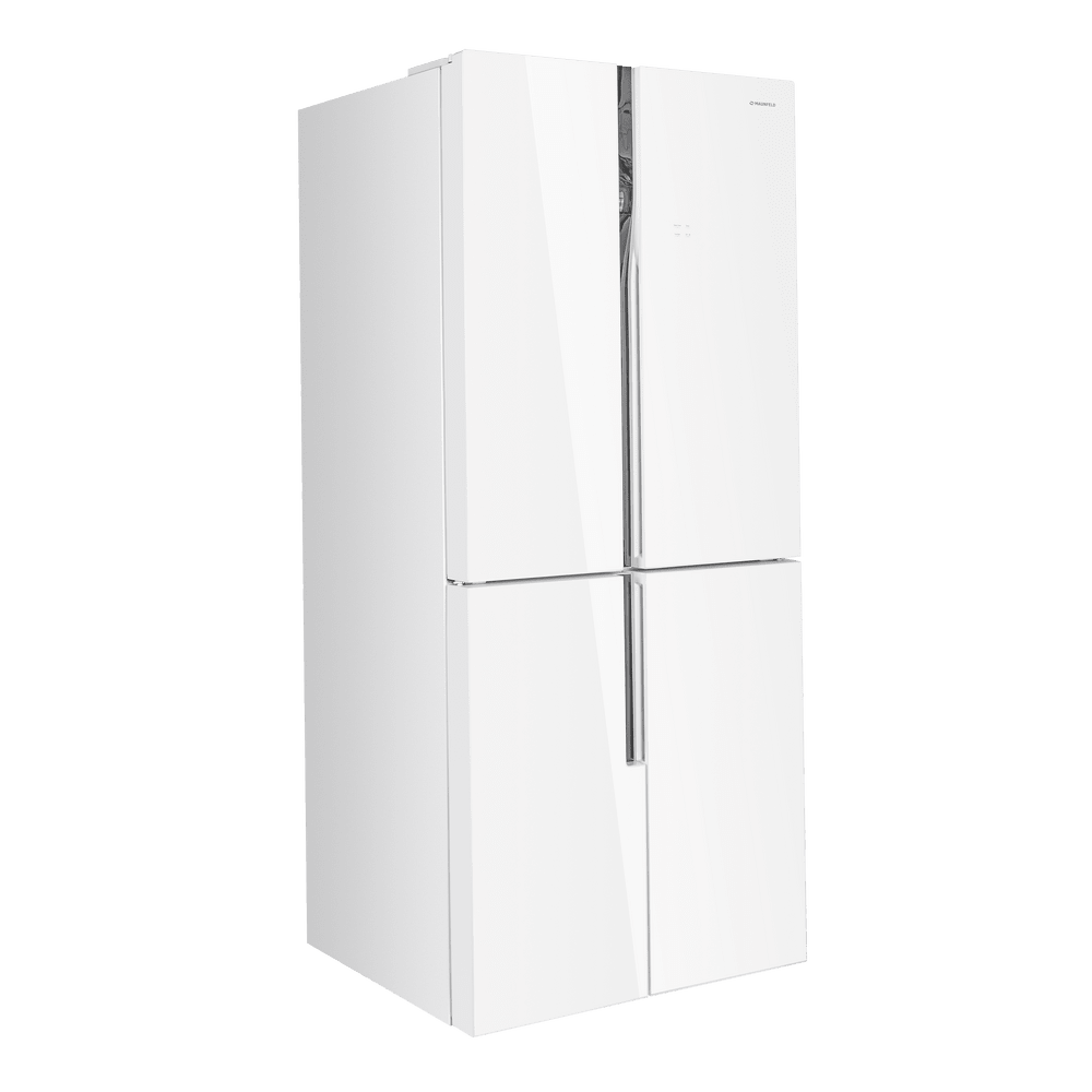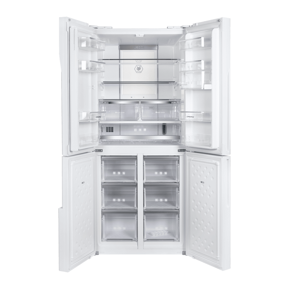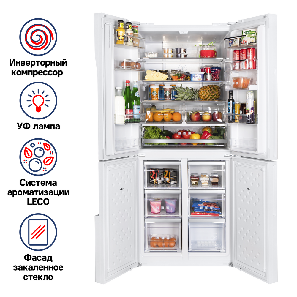 Корпус белого цвета высотой 182 см имеет ширину 78 см и сделан из металла. Фасады всех четырех дверей сделаны из закаленного стекла белого цвета. Внутренняя часть выполнена из антибактериального белого пластика легкой очистки и укомплектована устройством фильтрации «LECO», обеспечивающего увеличение времени хранения продуктов и продление свежести фруктов и овощей.