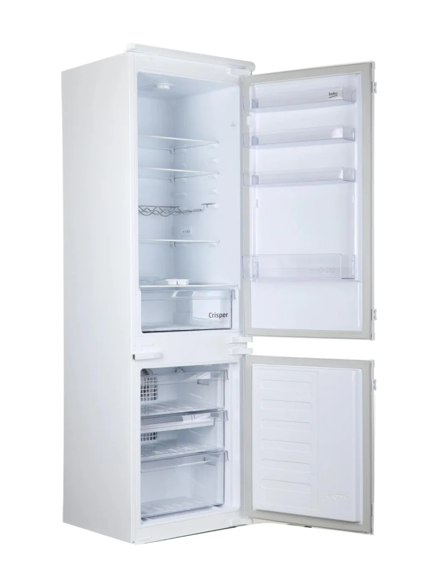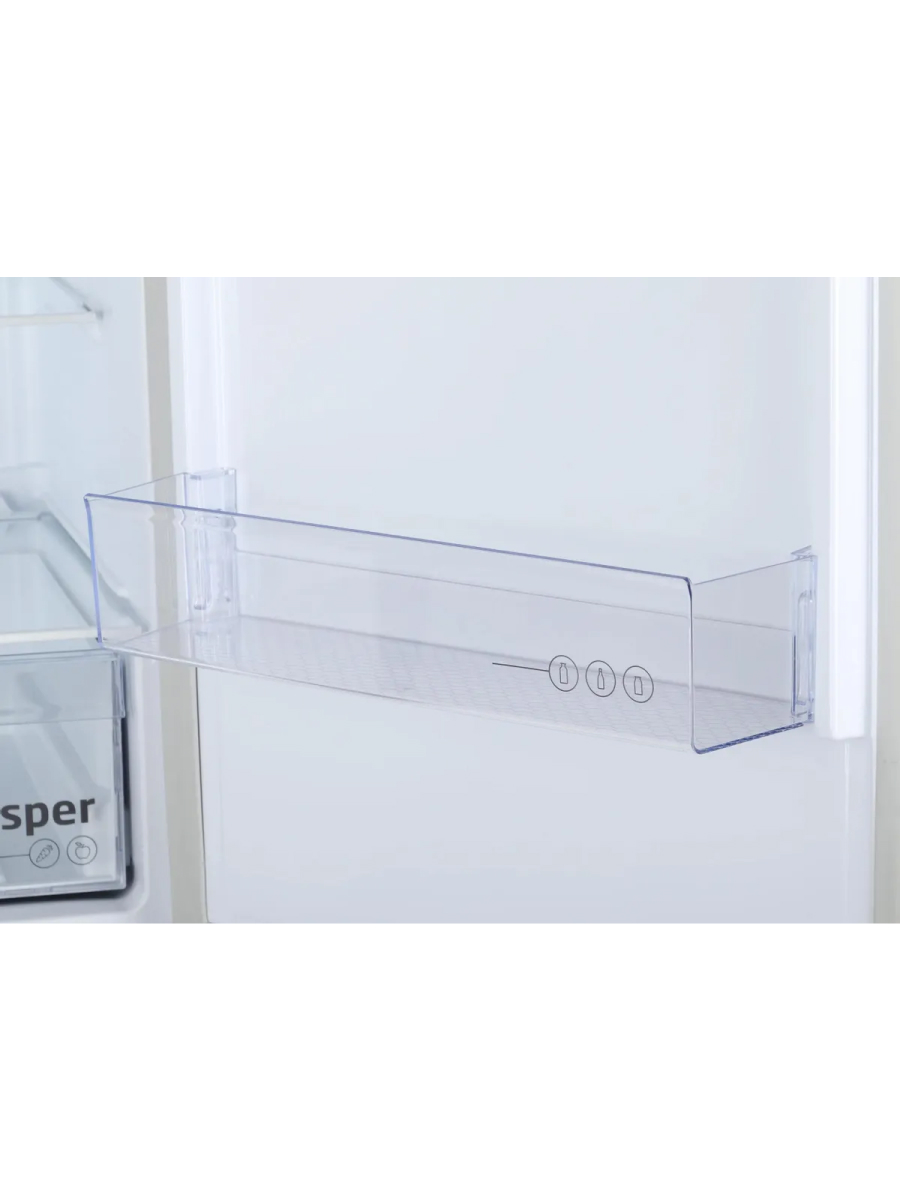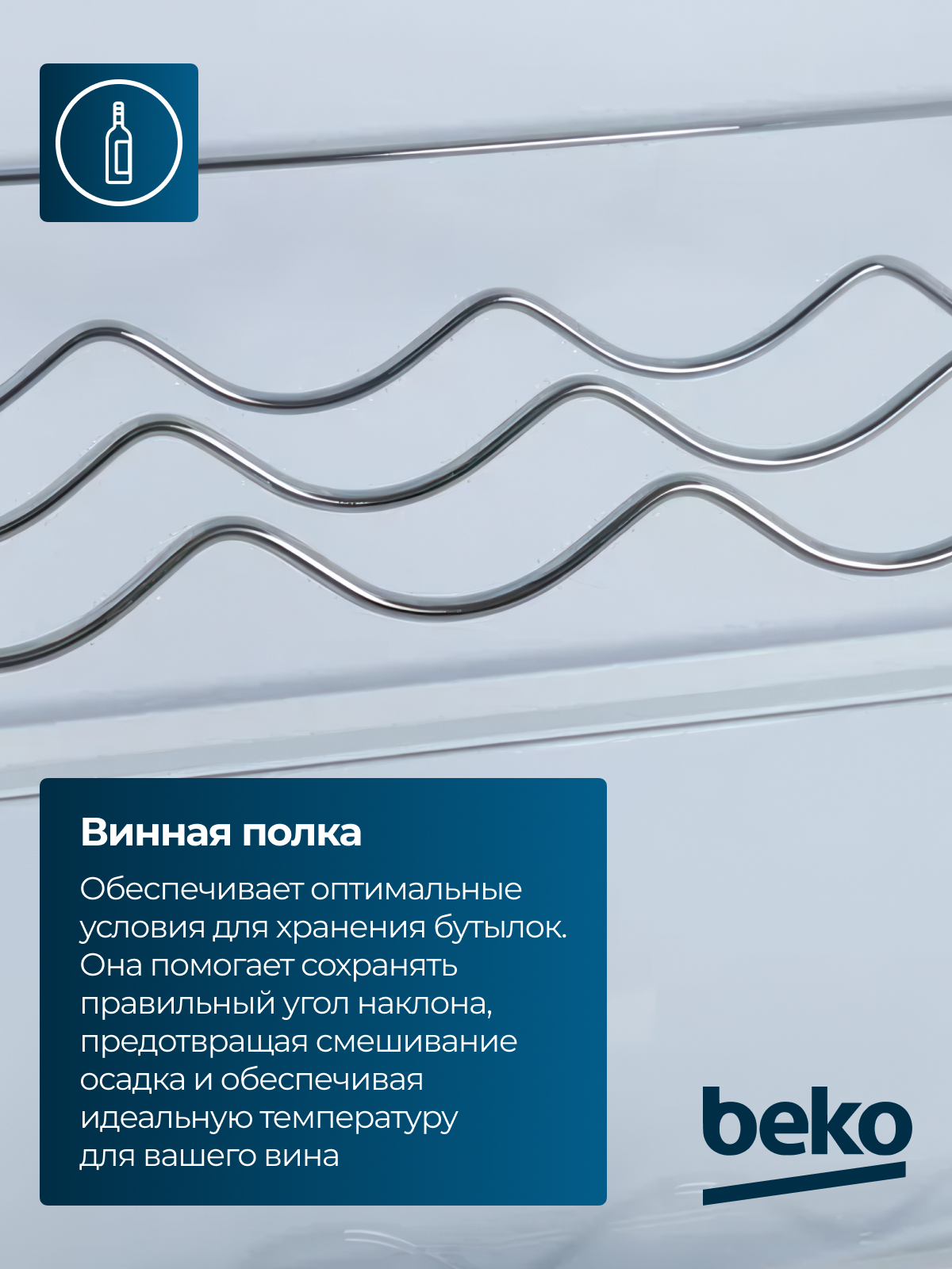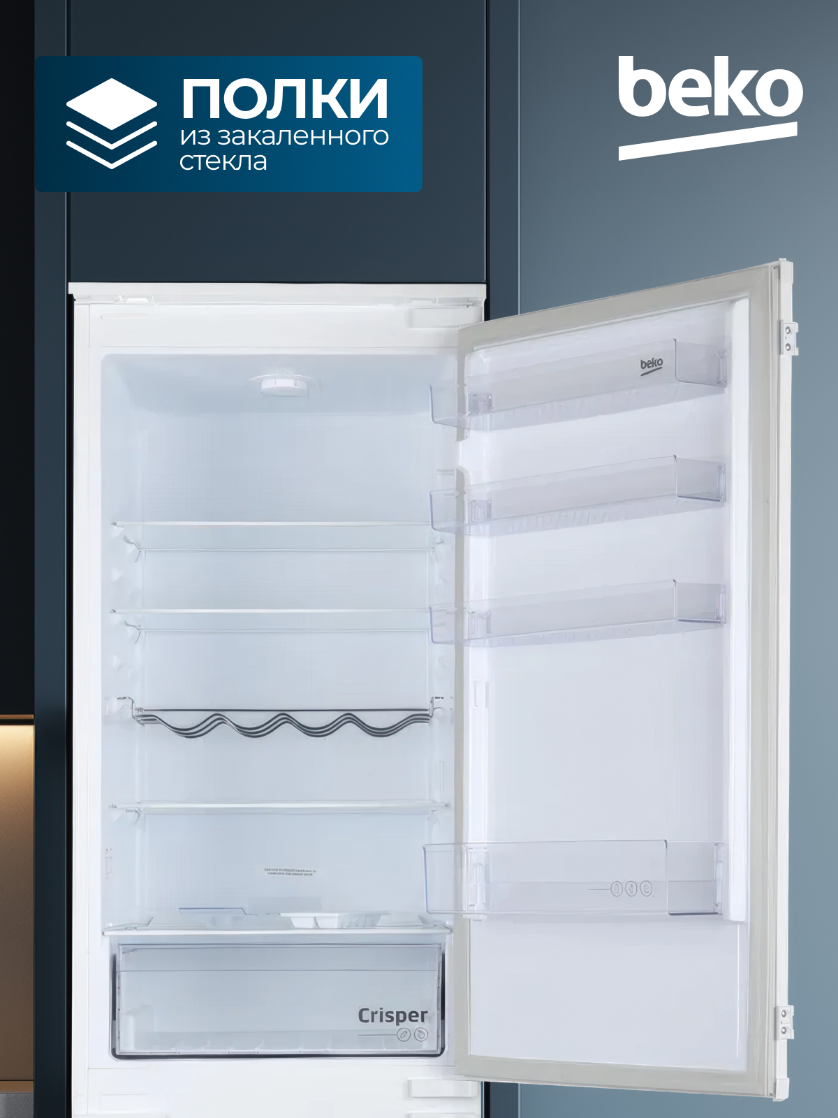Освещение LED, 3 стеклянные полки (регулир., закален. стекло), подставка для яиц, винная полка, 1 отделение для овощей и фруктов, 4 полноразмерные полки на двери, 3 ящика, лоток для льда