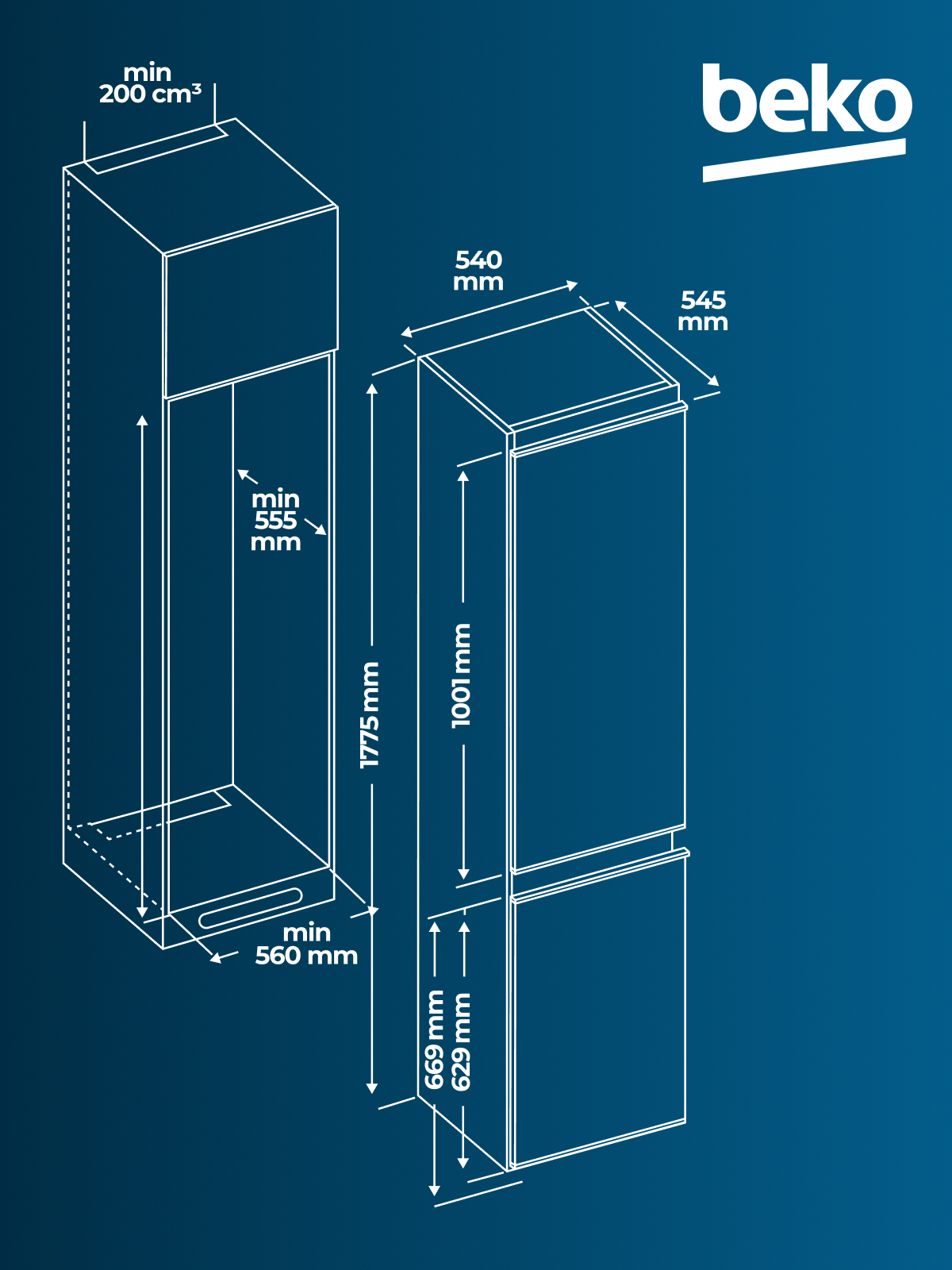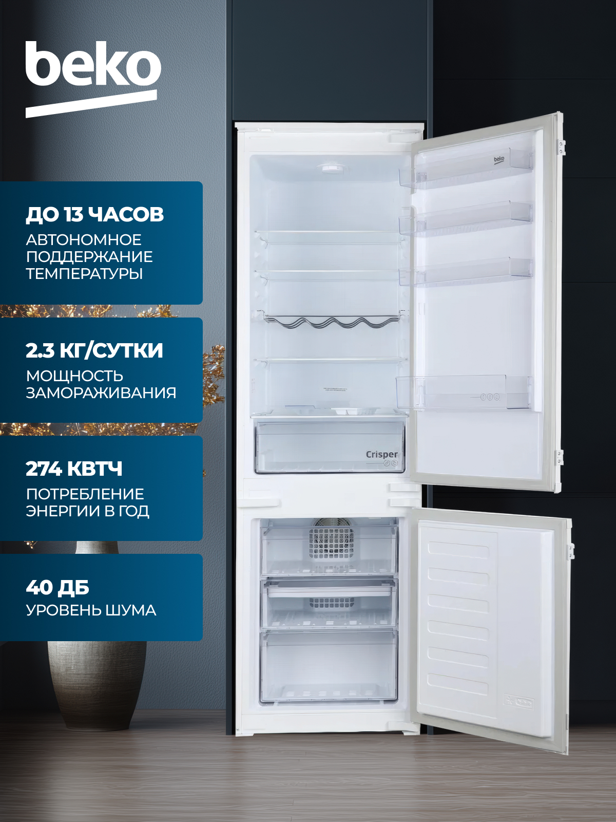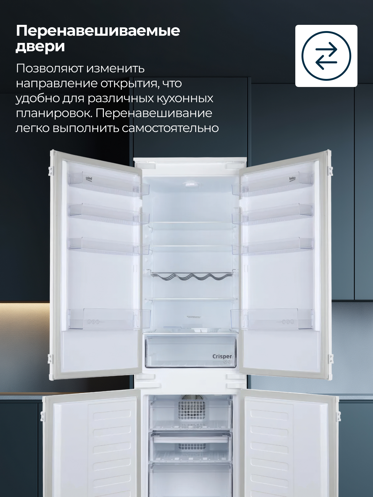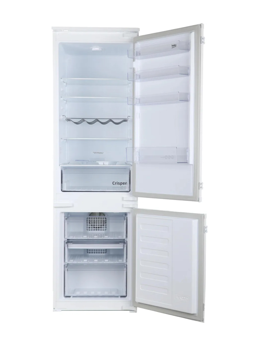 Освещение LED, 3 стеклянные полки (регулир., закален. стекло), подставка для яиц, винная полка, 1 отделение для овощей и фруктов, 4 полноразмерные полки на двери, 3 ящика, лоток для льда