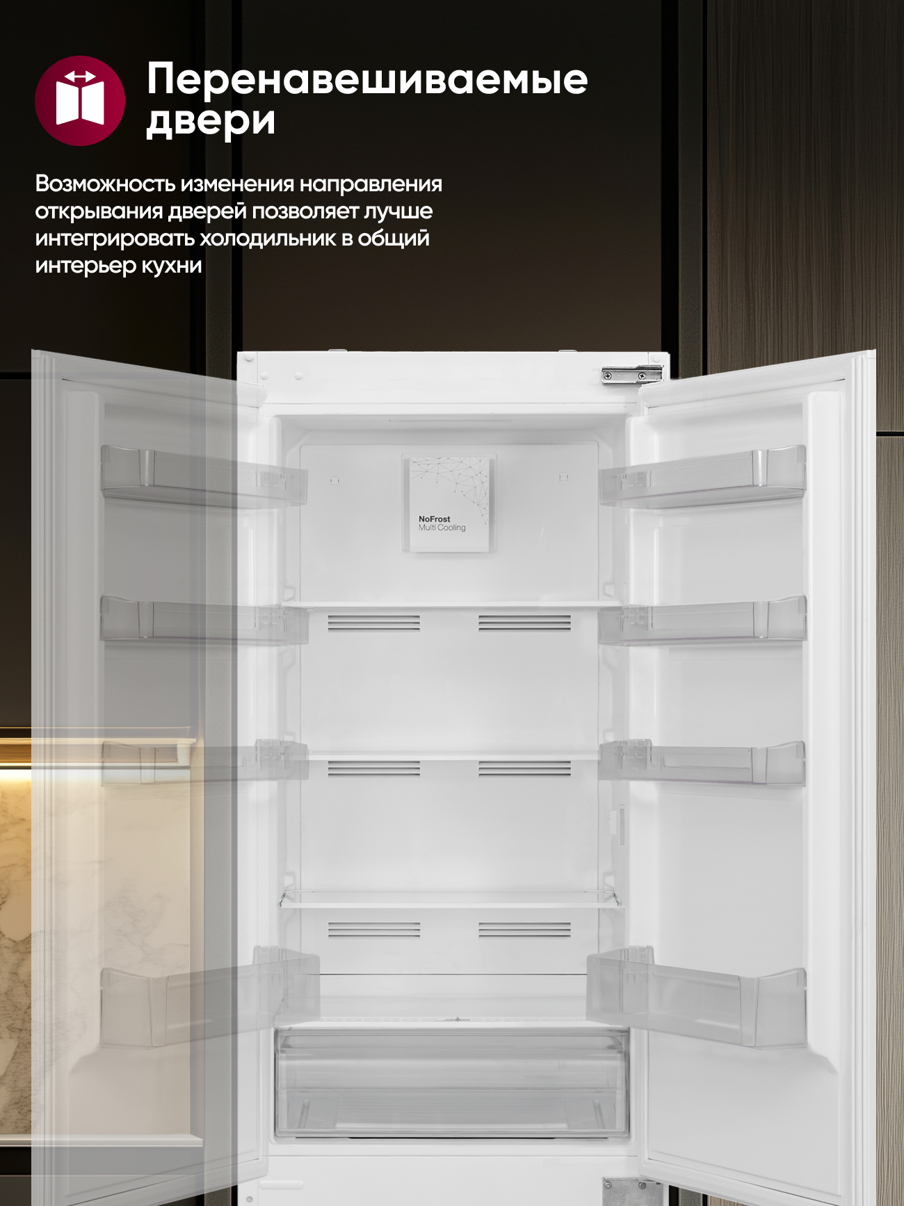 Перенавешиваемые двери позволяют выбрать удобное направление открытия — это важно для встроенной техники и помогает точно подогнать холодильник под планировку кухни.