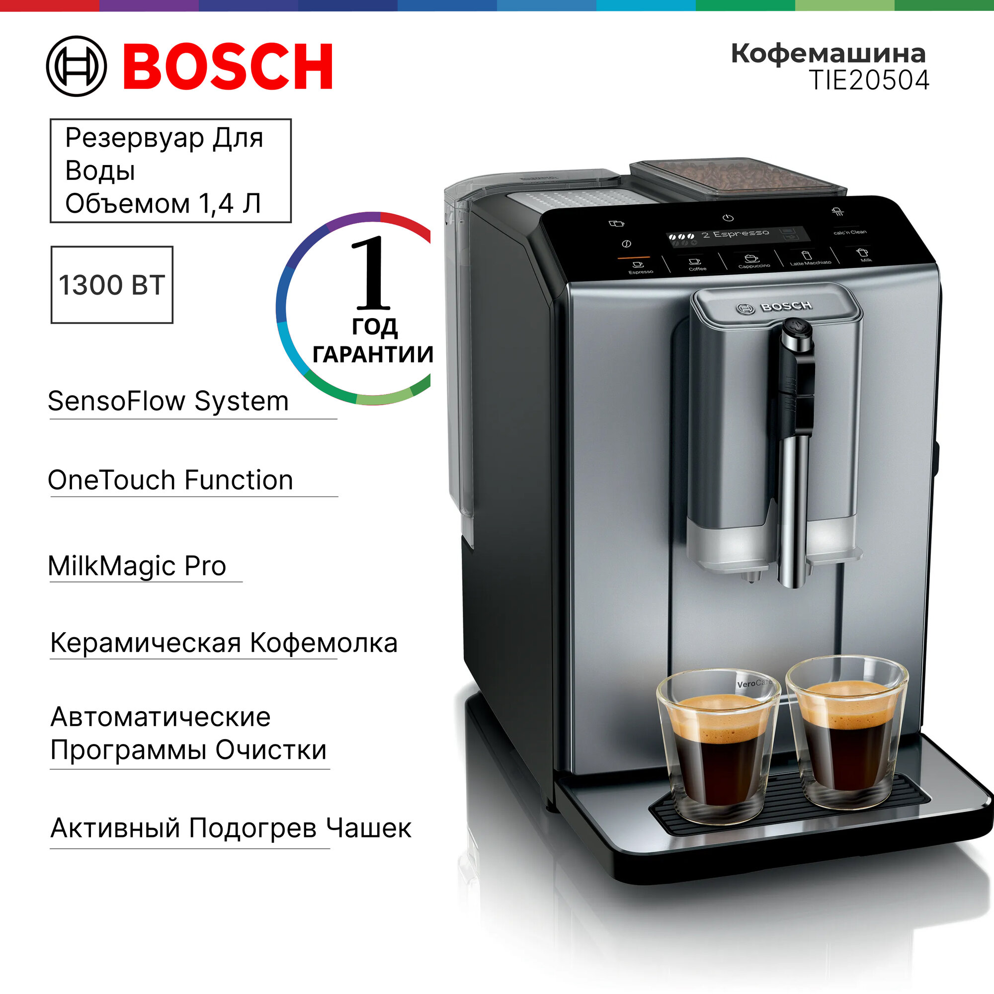 Кофемашина Bosch TIE20504, One Touch Double Cup, сенсоры температур, автоматическое приготовление 5 рецептов