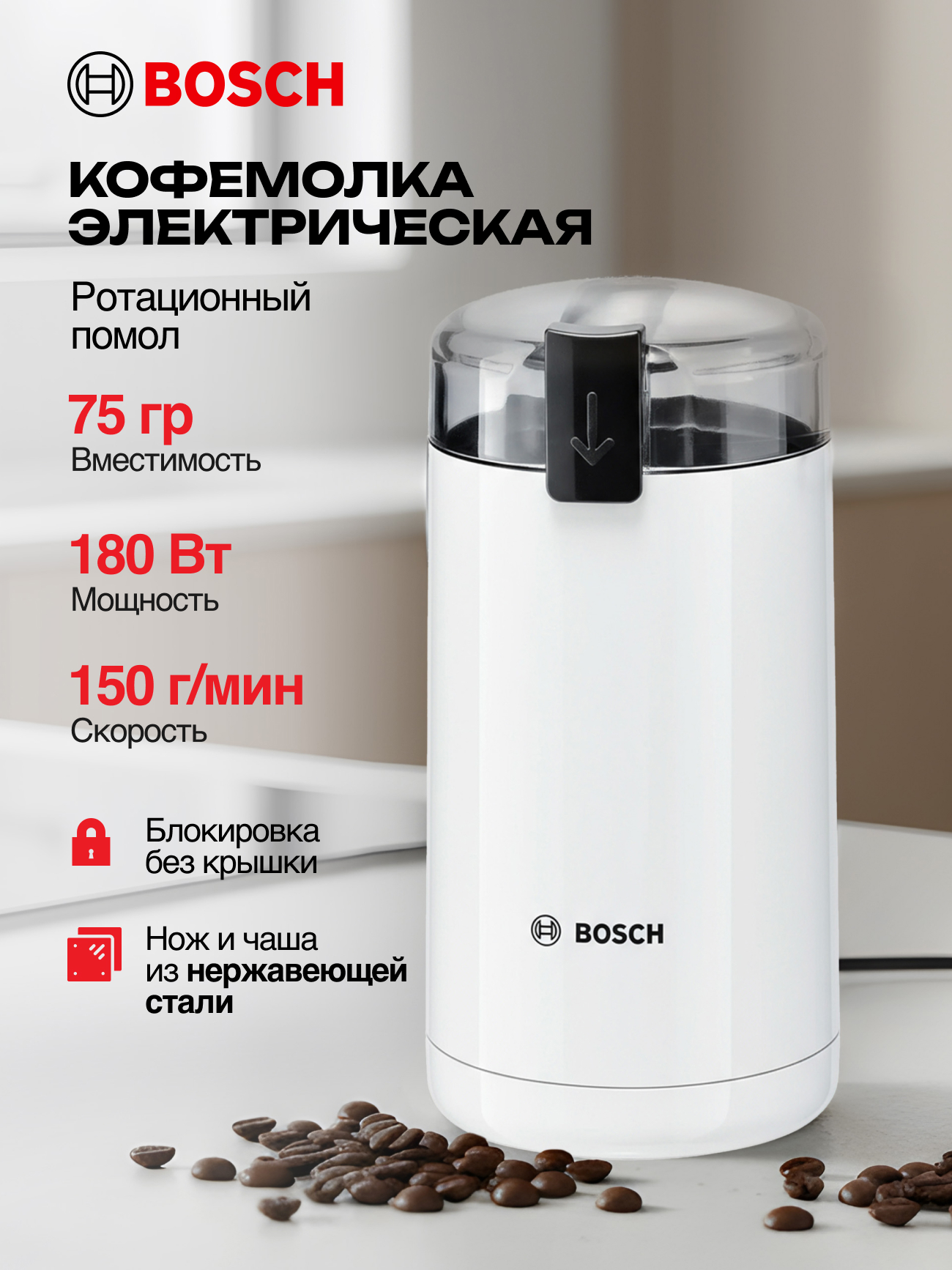 Кофемолка электрическая Bosch TSM6A011W, 180Вт, ротационный помол, вместимость 75 гр., 150гр/мин