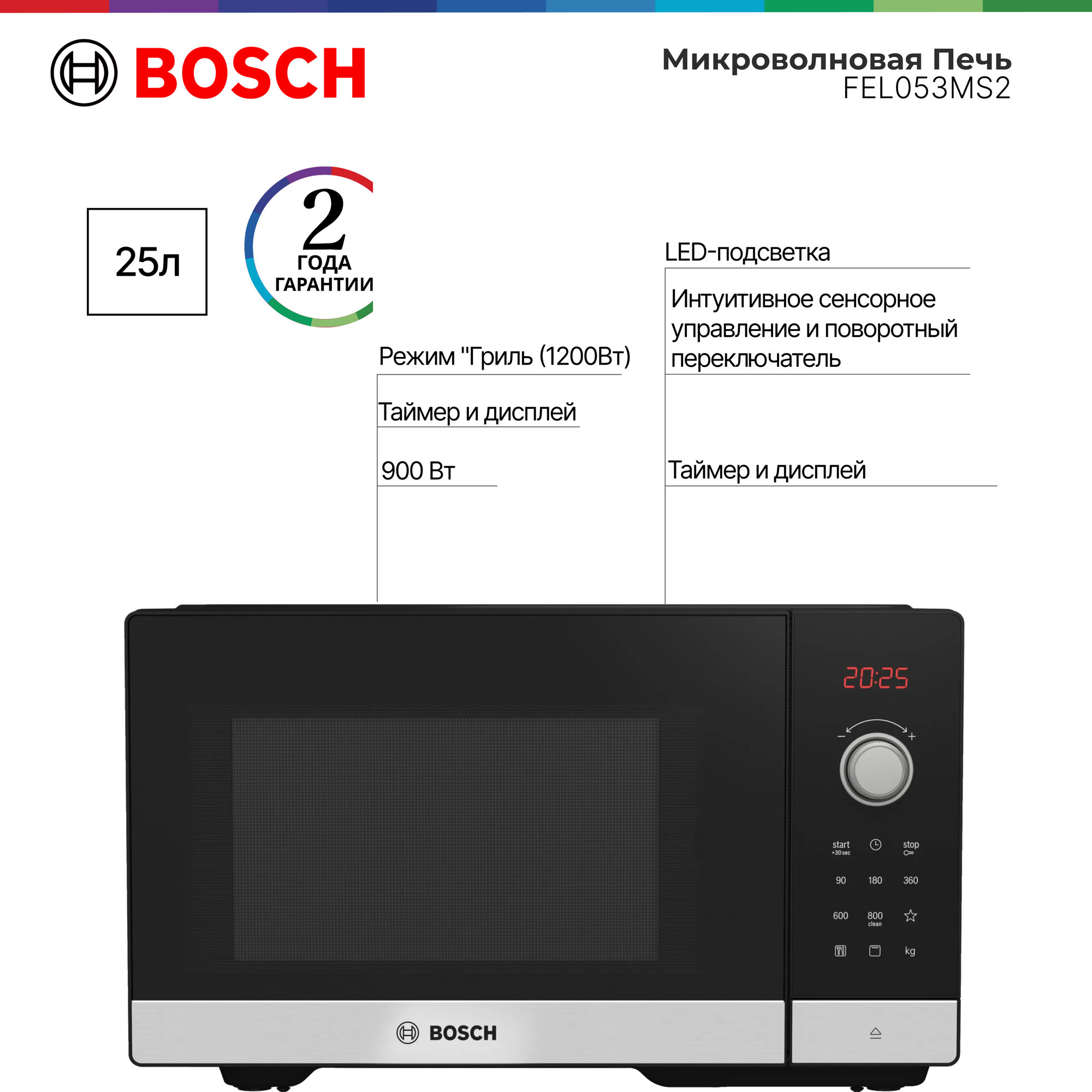 Микроволновая печь Bosch FEL053MS2 Serie 2, 25 л, 800 Вт, поворотный механизм, сенсор, гриль, дисплей ,черный