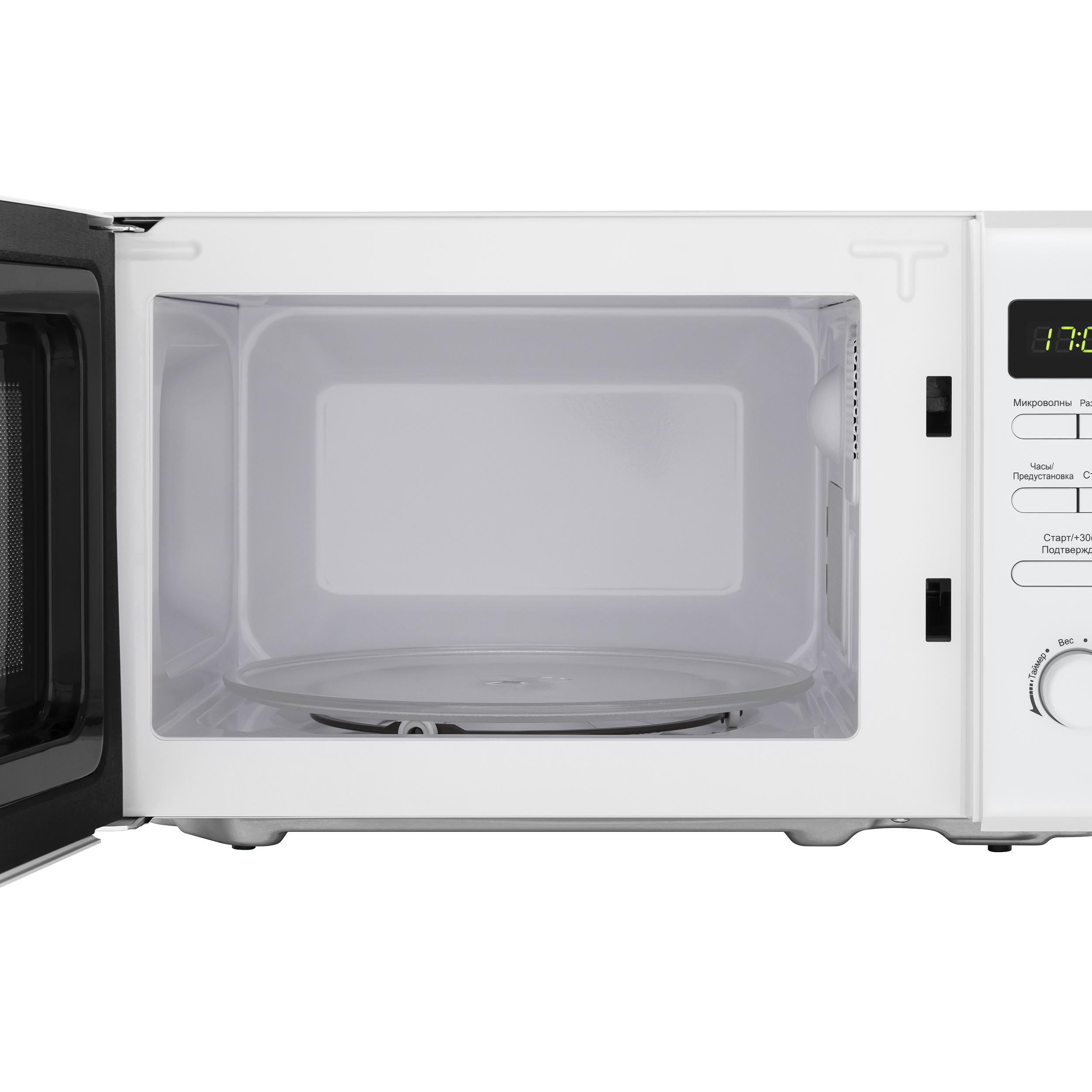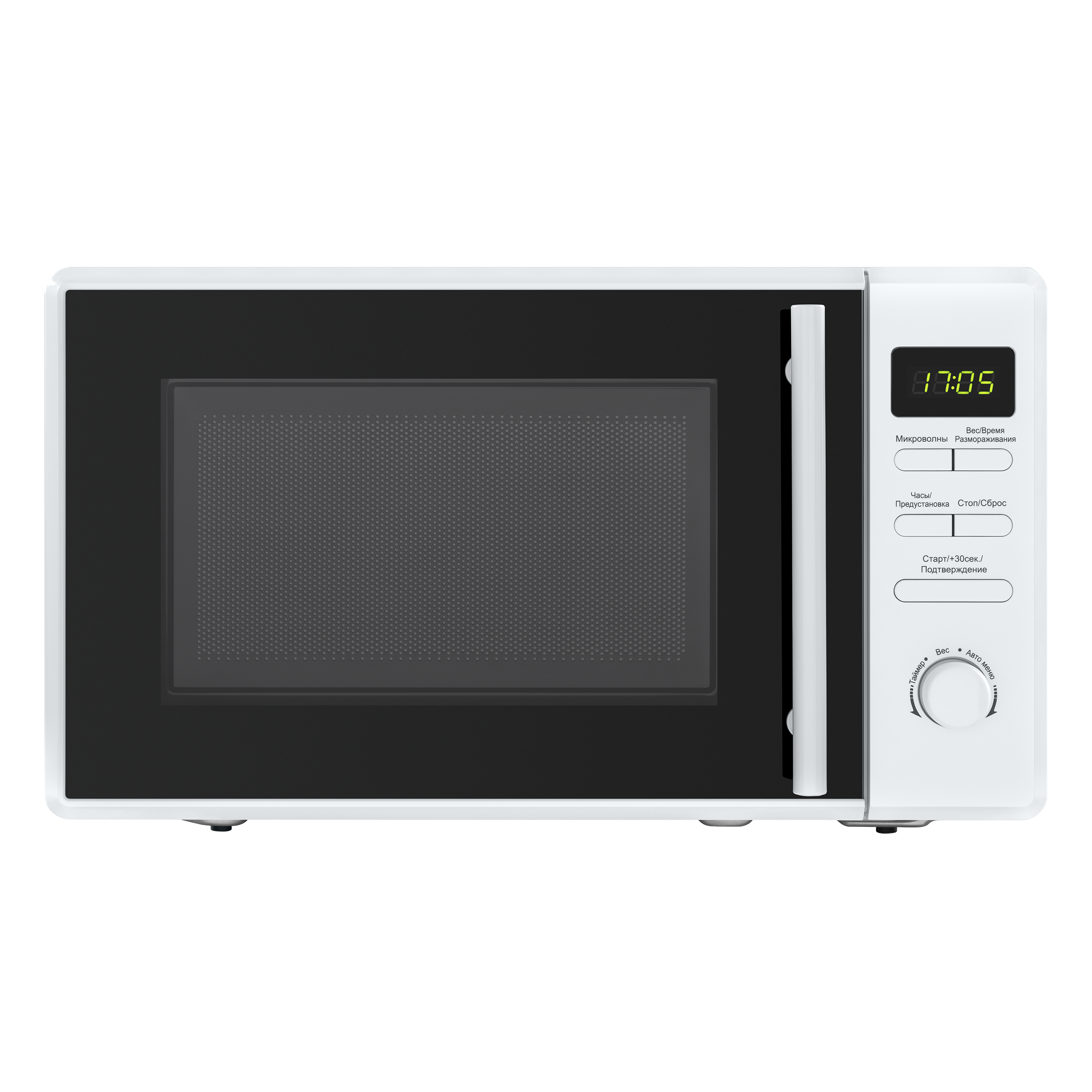 На передней панели СВЧ установлен дисплей. Ниже находятся кнопки управления, позволяющие выбрать: