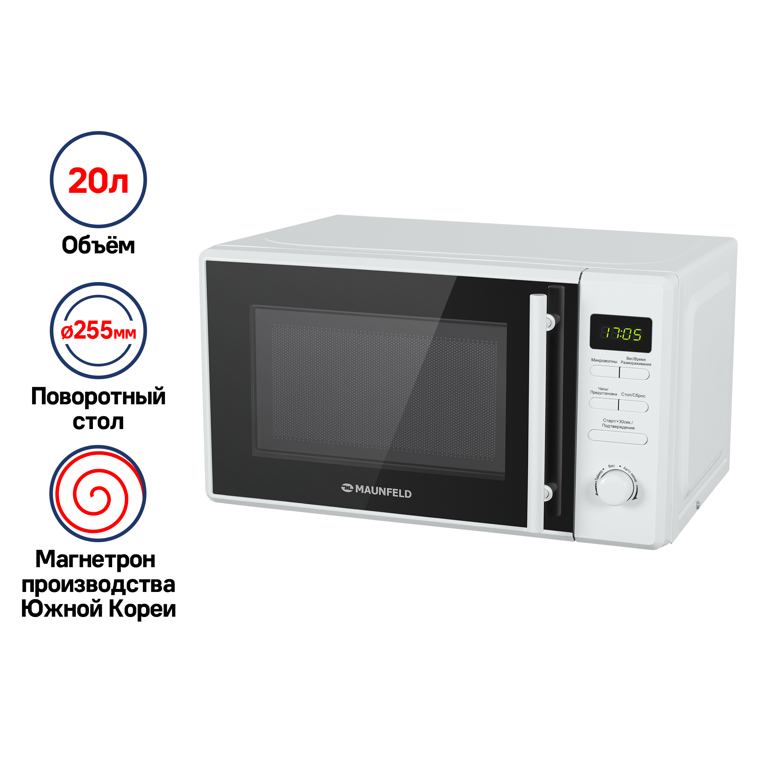Микроволновая печь мощностью 1150 Вт выполнена из нержавеющей стали и оснащена высококачественным магнетроном производства Южной Кореи. Ширина печи всего 44 см, что позволяет поместить ее в любой кухне.