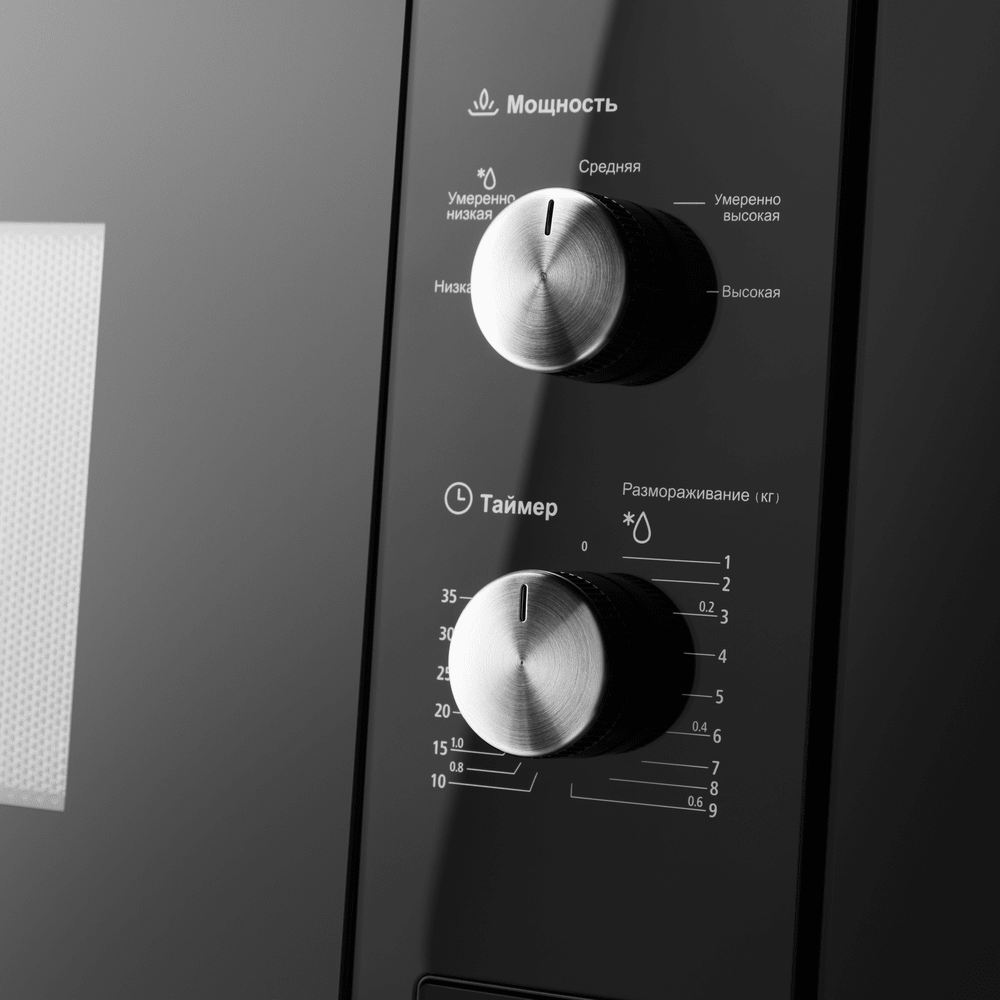Управление СВЧ осуществляется с помощью 2 поворотных переключателей. Первая ручка – это выбор одного из 5 уровней мощности. Вторая – это механический таймер на 35 минут или выбор веса продукта в режиме разморозки.