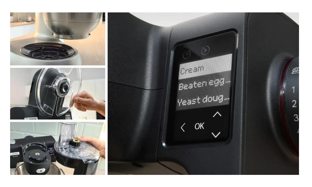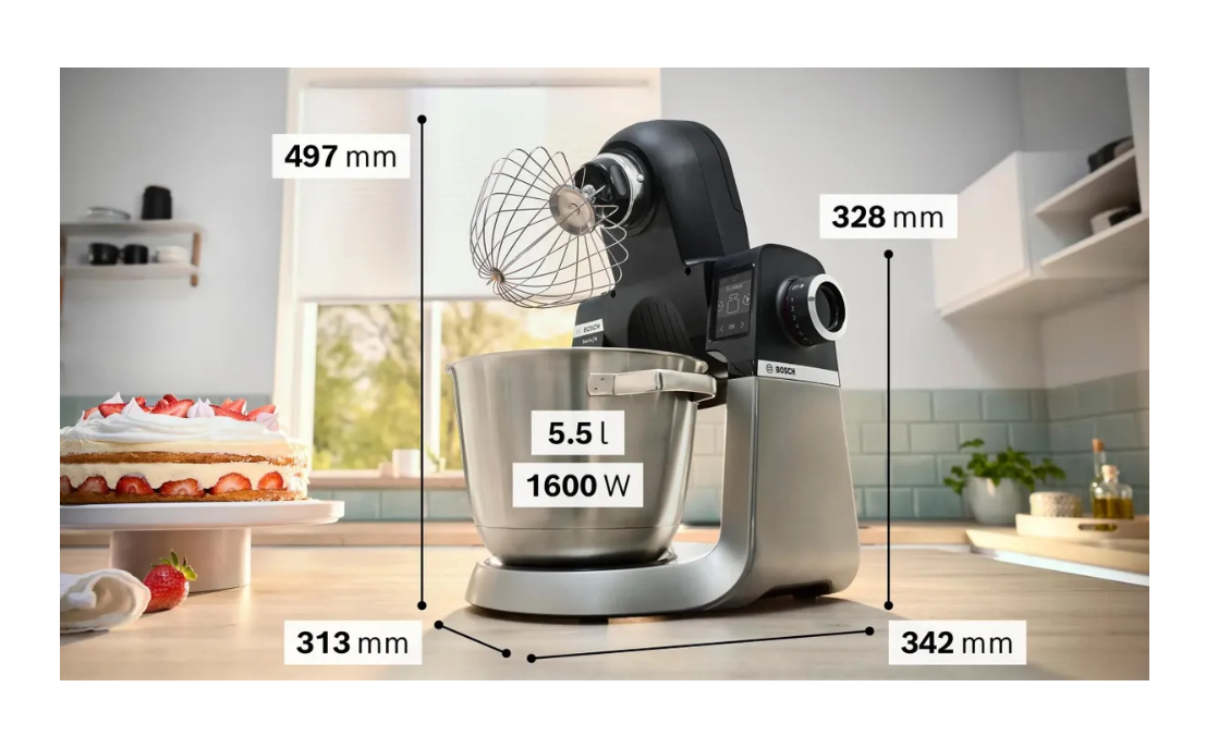 Bosch MUM58720 оснащен вместительной чашей из нержавеющей стали, которая позволяет замешивать до 2,7 кг легкого или 1,9 кг дрожжевого теста. В комплекте с комбайном идут кондитерские насадки, которые вращаются по планетарному принципу, обеспечивая равномерное распределение ингредиентов и отсутствие остатков на дне и стенках чаши.