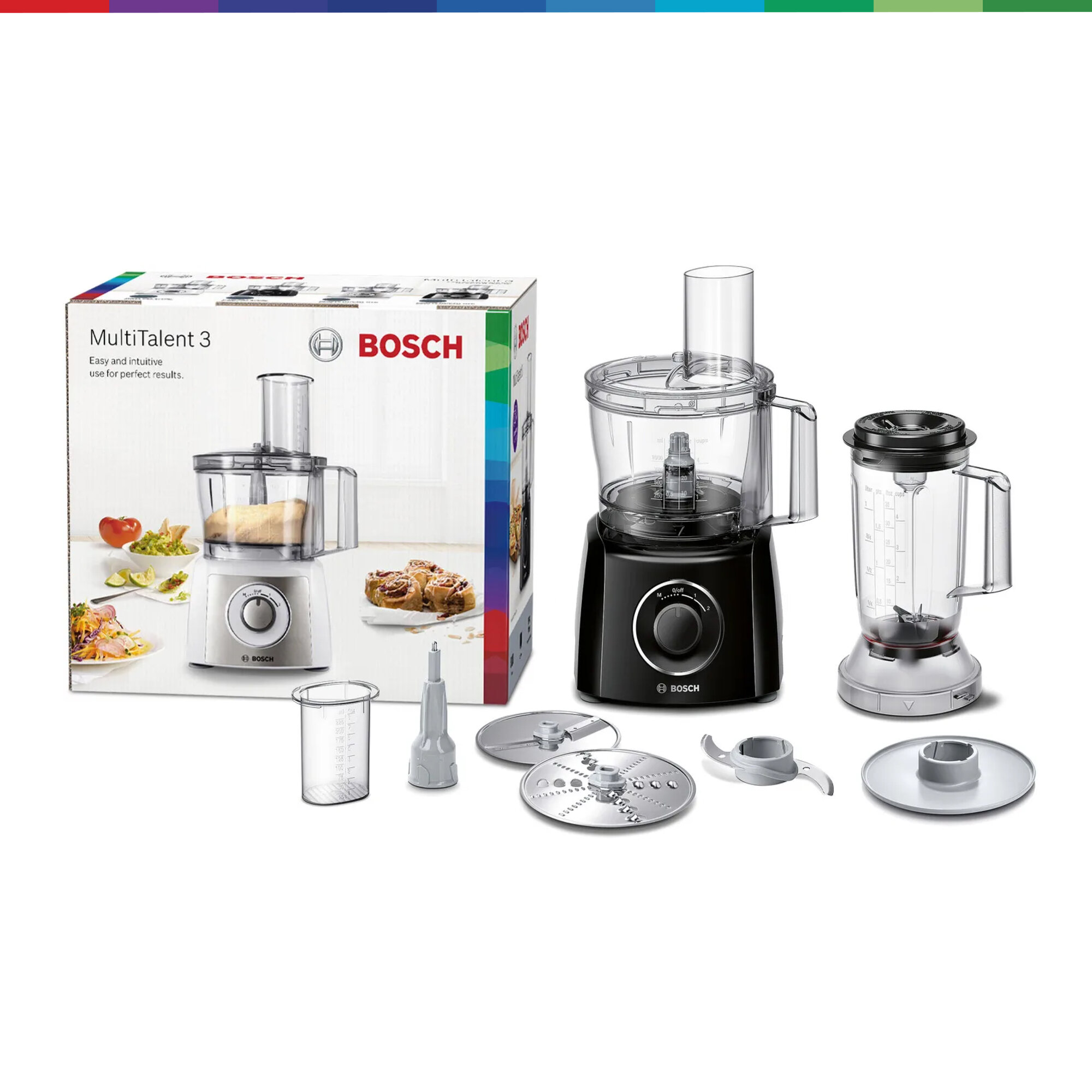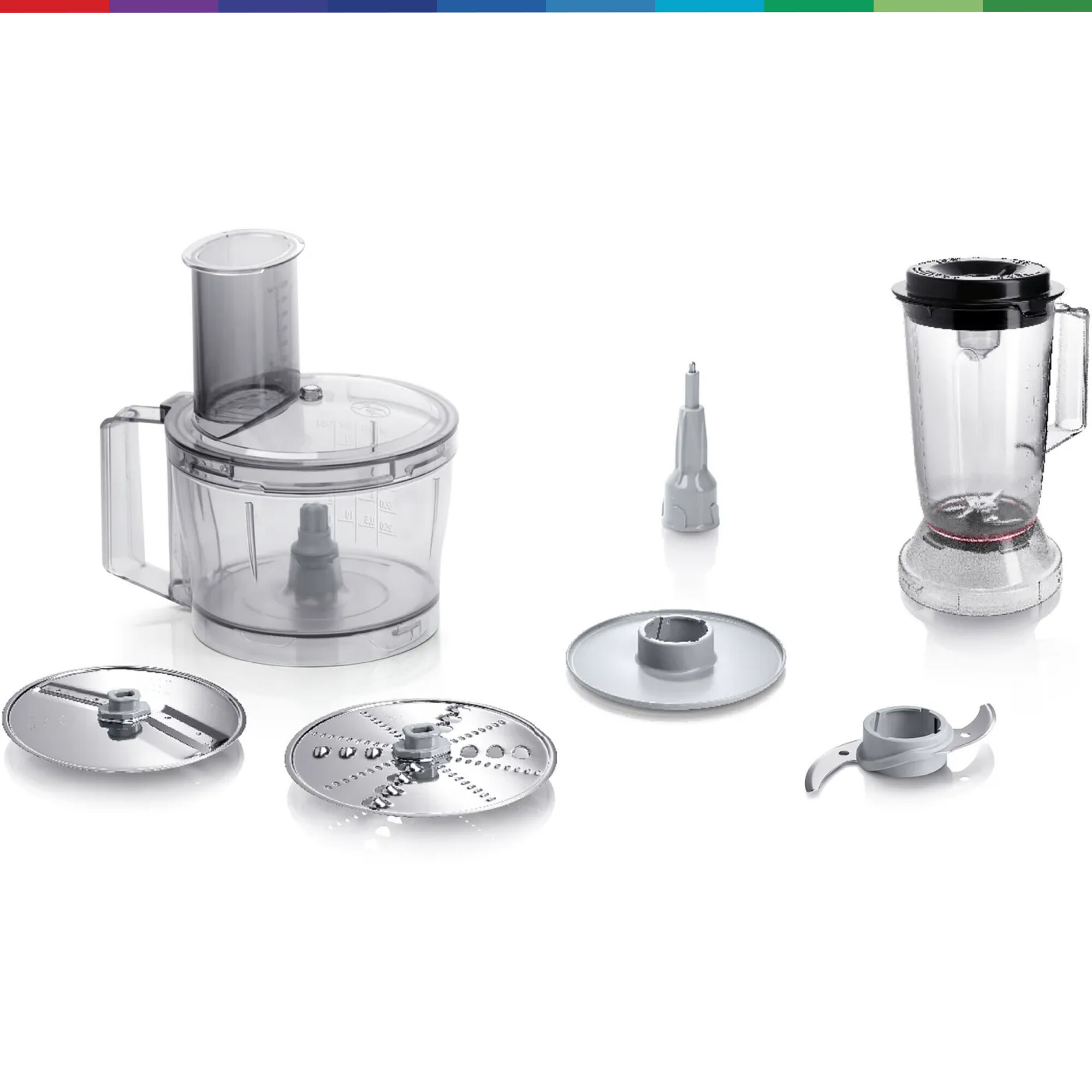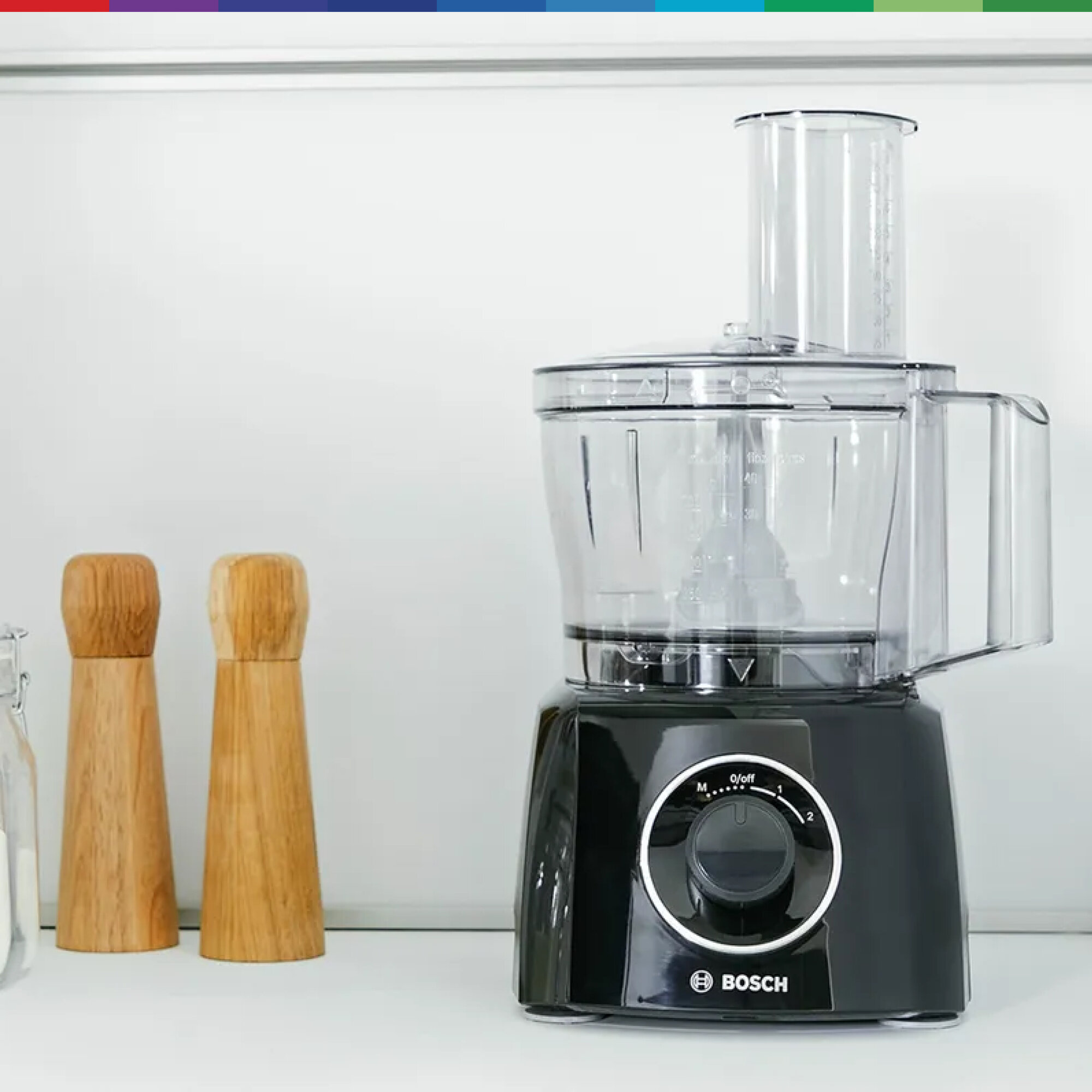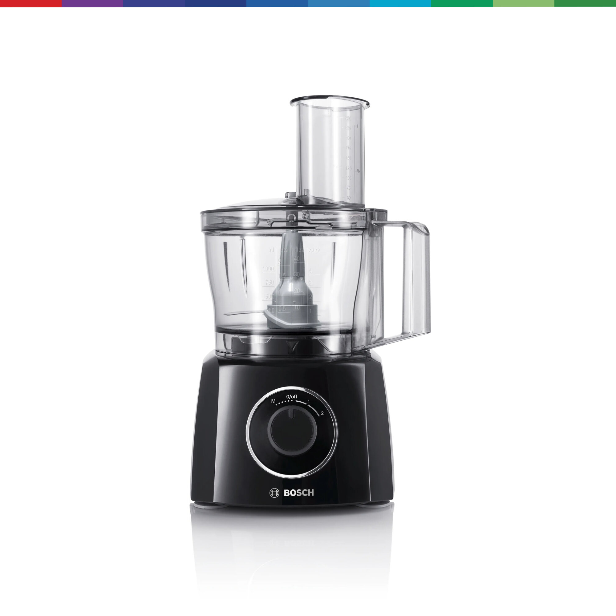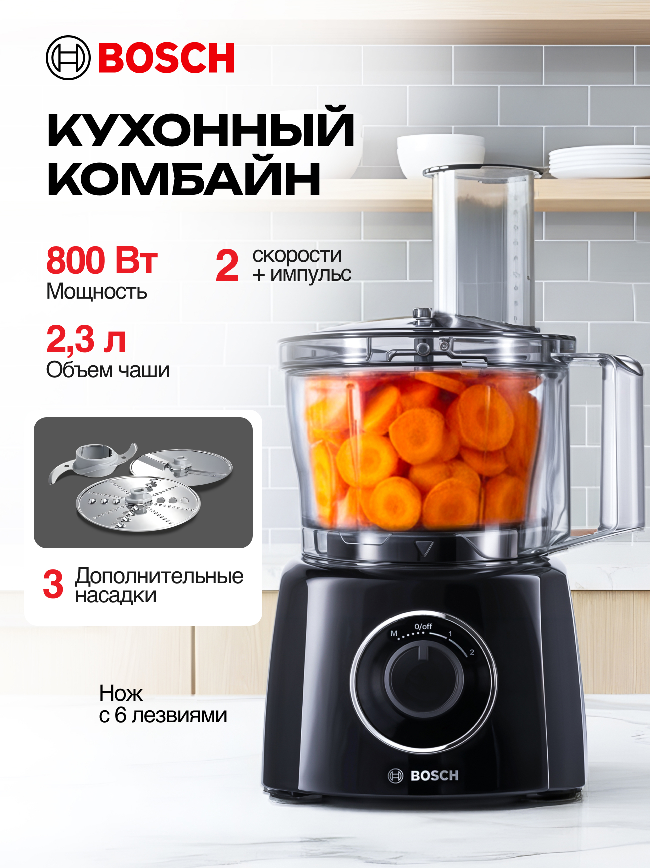 Страна производства: Словения. Товар новый в заводской упаковке. Кухонный комбайн Bosh MCM3201B Multitalent 3 оснащен двумя рабочими скоростями и укомплектован четырьмя различными насадками для измельчения, шинковки и взбивания пищевых продуктов. Также модель оборудована функцией блендера для интенсивного смешивания жидкостей. Управление устройством осуществляется механически посредством крутящейся ручки на пластиковом корпусе. «Импульсный» режим включает электрический двигатель на полную мощность. В случае перегревания мотор автоматически деактивируется, обеспечивая безопасность при работе с моделью.Кухонный комбайн Bosh MCM3201B Multitalent 3 укомплектован чашей объемом 2,3 л, емкостью для блендера, которая вмещает 1 л жидкости, а также пластиковым мерным стаканом. С устройством поставляется толкатель, исключающий прямой контакт с движущимися элементами. Надежный корпус оборудован отделением для хранения провода и оснащен прорезиненными ножками, которые обеспечивают устойчивость конструкции на поверхности стола. Комбайн работает от сети напряжением 220 В и на пике производительности достигает мощности 800 Вт.