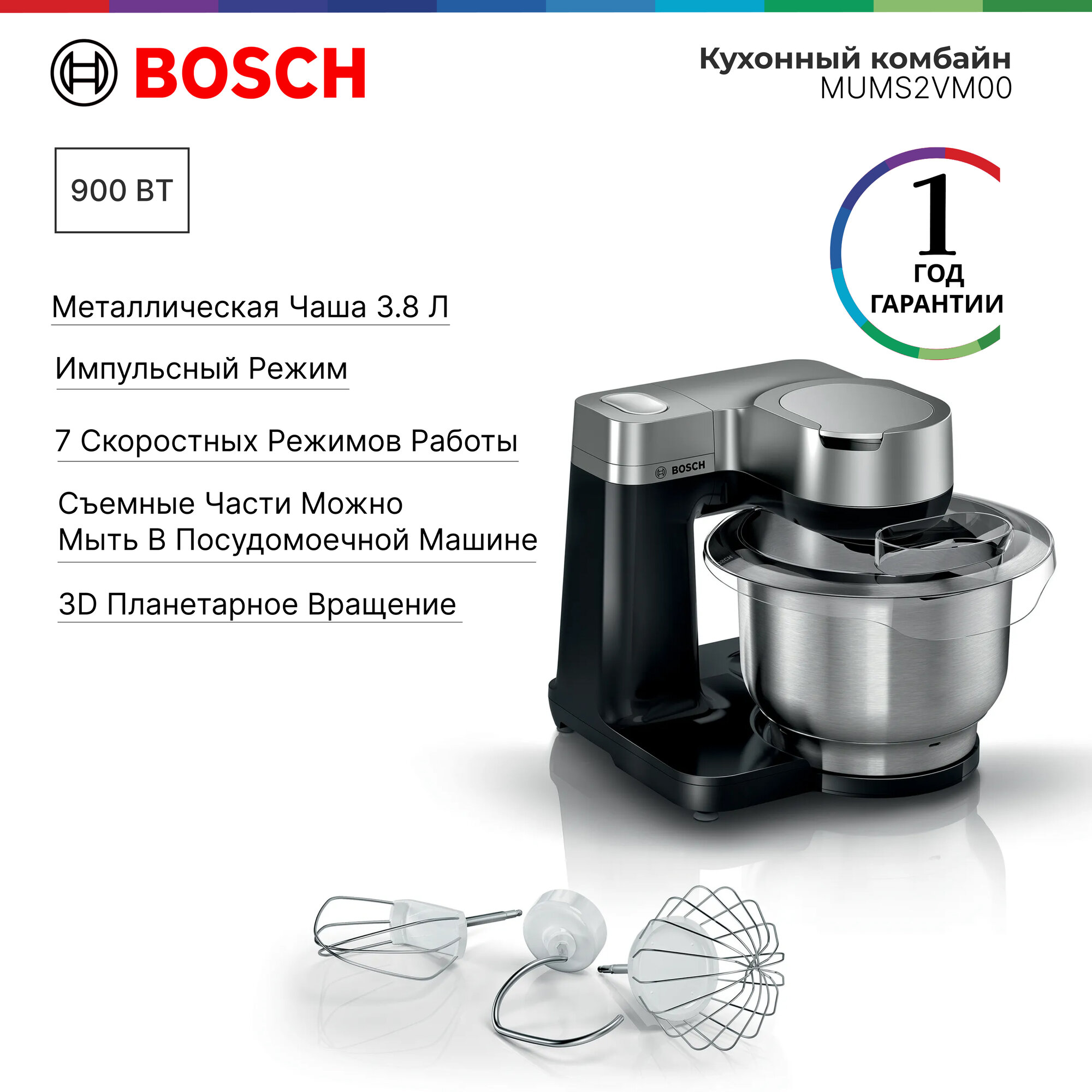 Кухонная машина BOSCH MUMS2VM00 из серии MUM2 — это многофункциональный помощник на кухне с мощным двигателем на 900 Вт. Она оснащена чашей из нержавеющей стали объемом 3,8 литра, которая позволяет замешивать до 2 кг теста. Корпус устройства выполнен из прочного пластика, а все металлические насадки можно мыть в посудомоечной машине, что делает уход за прибором быстрым и легким.