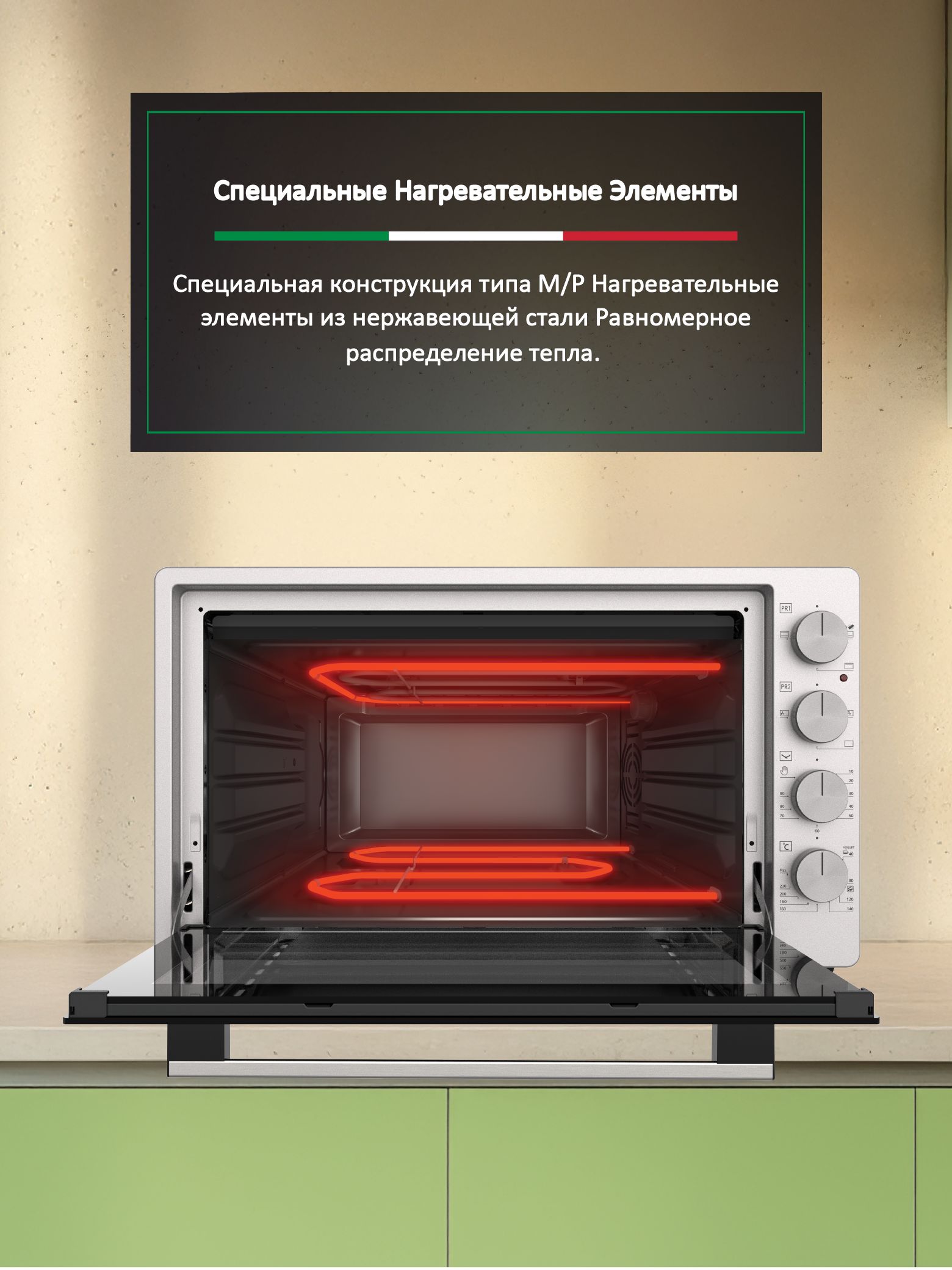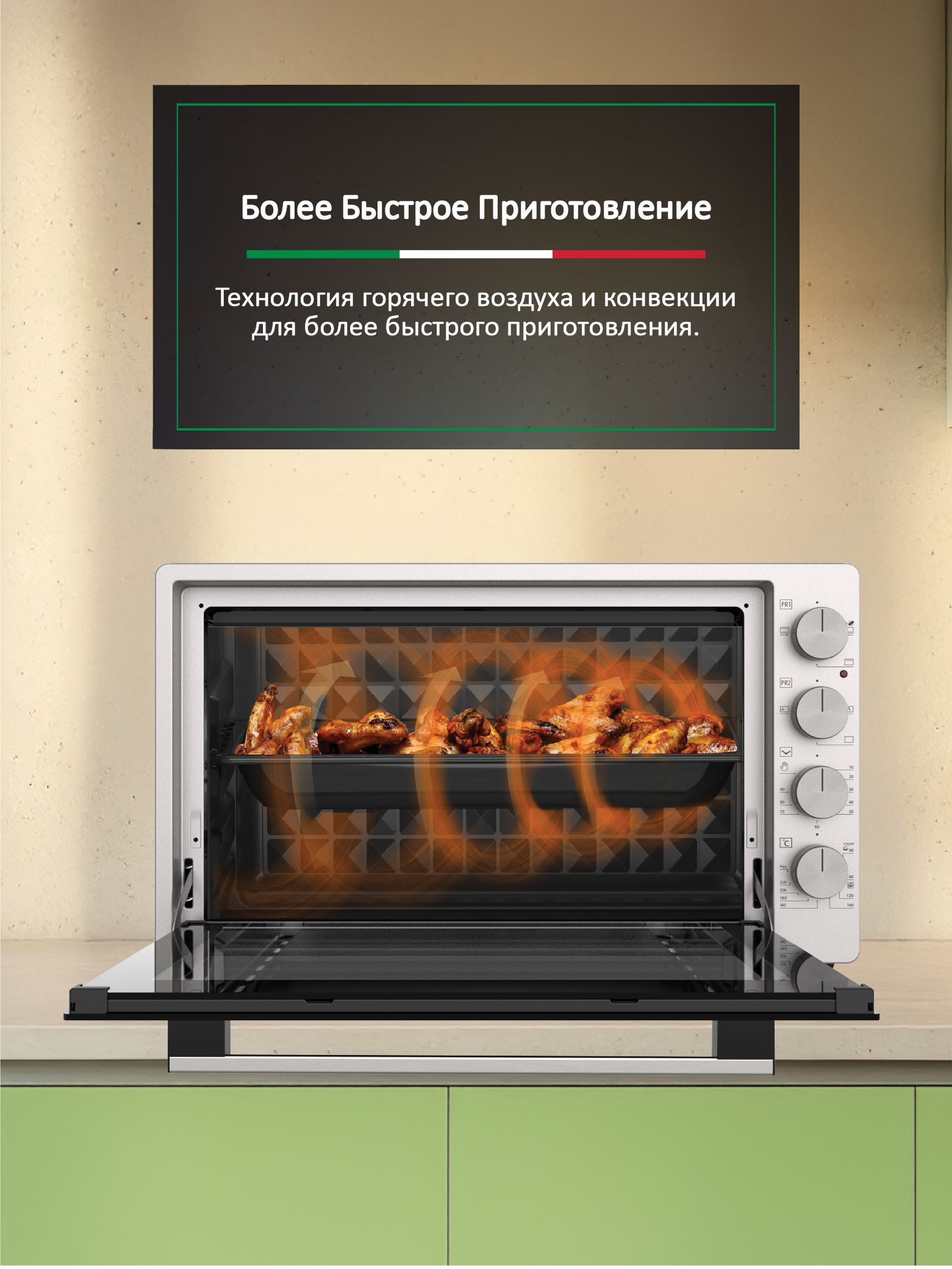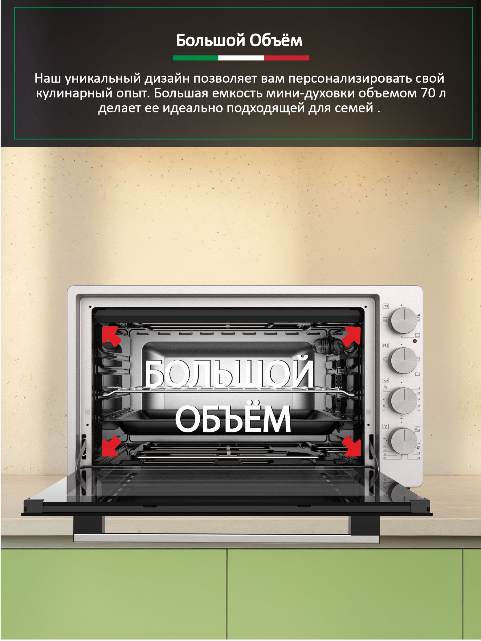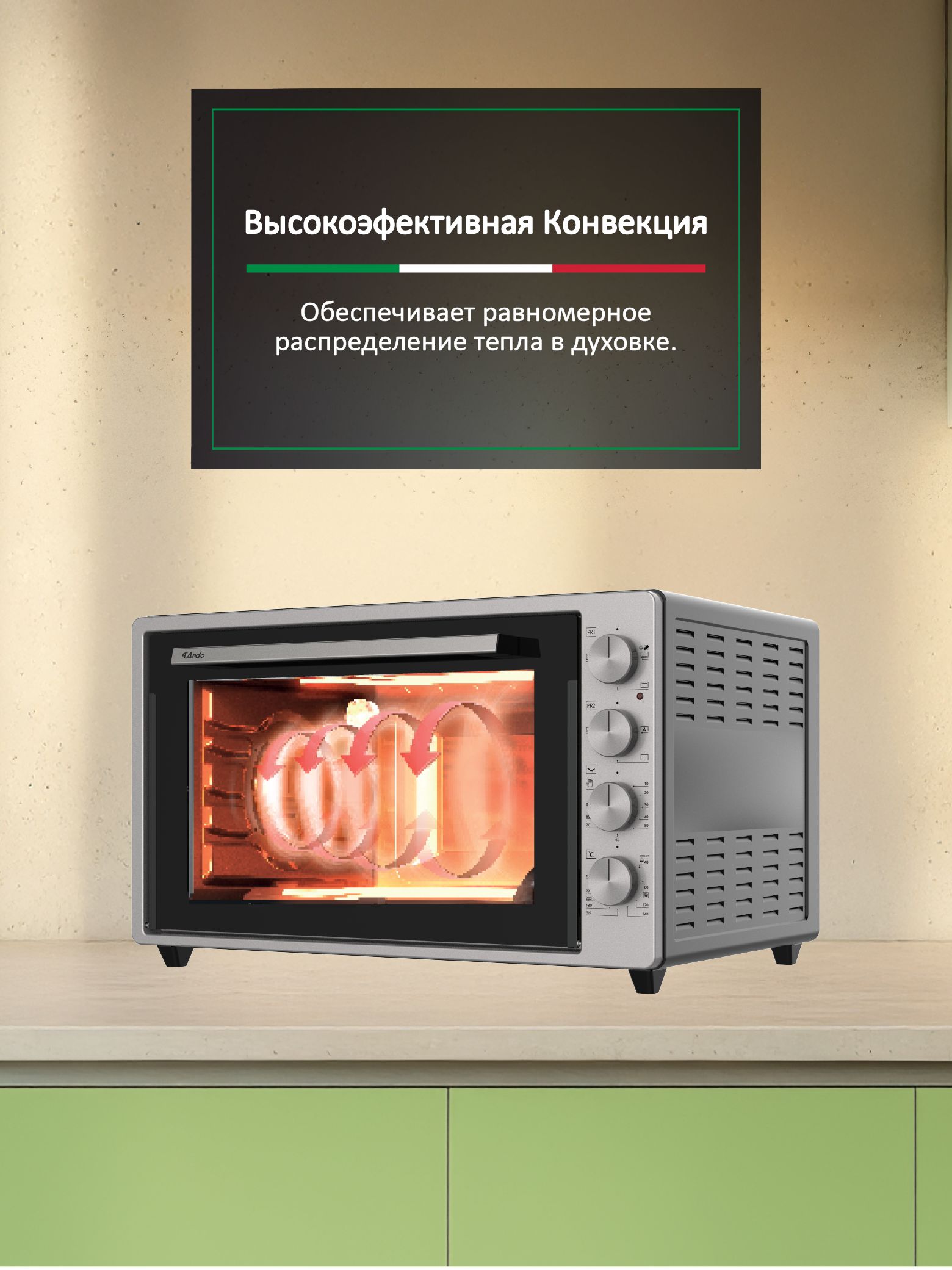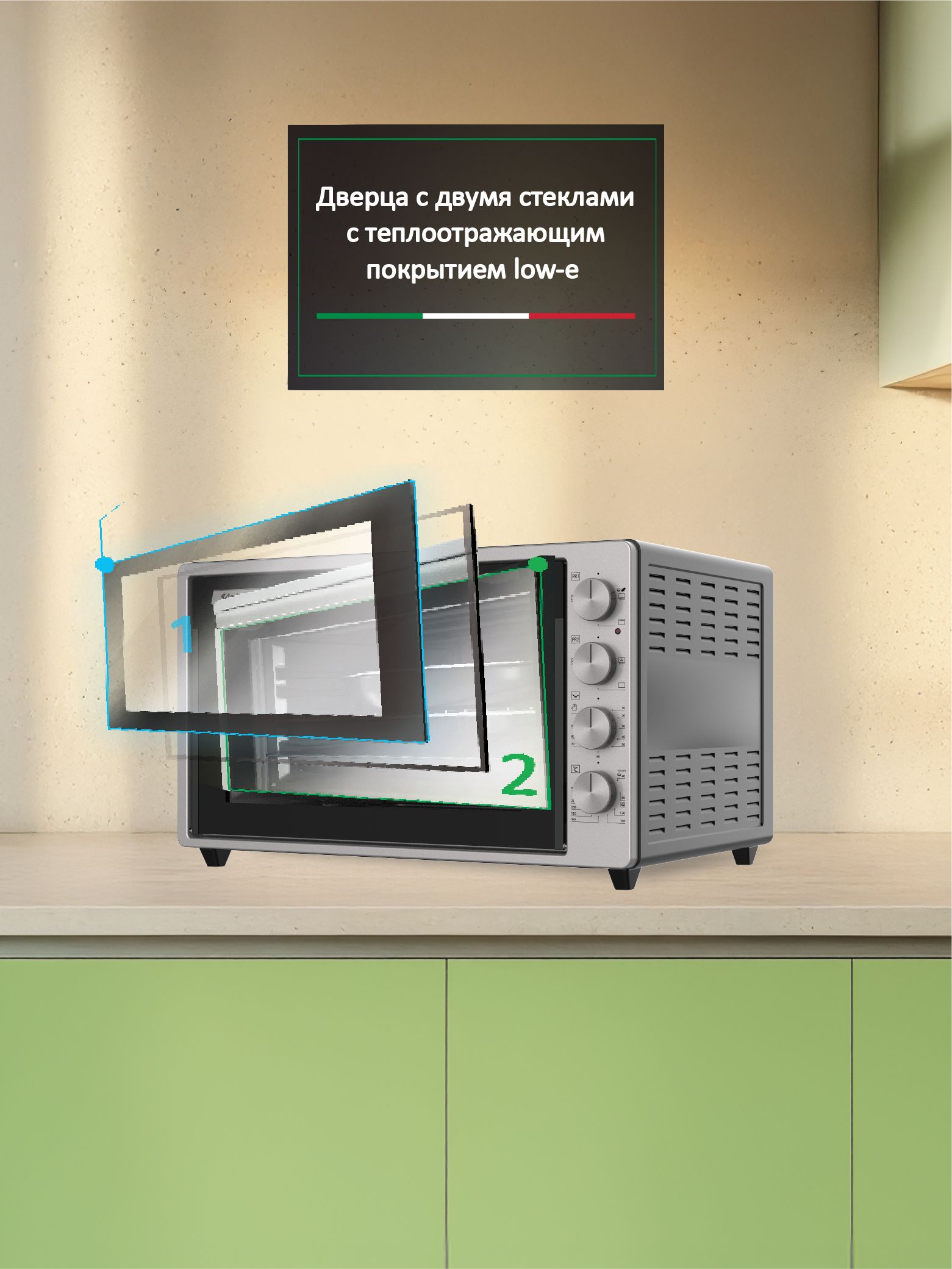 Мини-печь с 5 режимами – идеальный помощник для вашей кухни. Объем 70 литров позволяет готовить разнообразные блюда для всей семьи. Вы сможете запекать, жарить, готовить на гриле и использовать конвекцию для равномерного прогрева пищи. Благодаря механическому таймеру, который отсчитывает время до 90 минут, вы сможете готовить с удобством и без лишних забот. Двойное стекло дверцы обеспечивает надежную изоляцию температуры, что помогает сохранять тепло внутри и предотвращает перегрев внешней поверхности. Это особенно важно для безопасности, если у вас есть маленькие дети. Турбовентилятор равномерно распределяет горячий воздух, что ускоряет процесс приготовления и позволяет добиться идеальной корочки на запеченных блюдах. В комплектацию входят два противня и хромированная решетка, что дает возможность готовить сразу несколько блюд одновременно. Мини-печь прекрасно впишется в интерьер вашей кухни, а ее компактные размеры не займут много места. Легкость в управлении и многофункциональность делают эту мини-печь отличным выбором для тех, кто ценит комфорт и качество в приготовлении пищи. Покупая данную модель, вы получаете надежность и удобство, которые сделают процесс готовки быстрым и увлекательным.