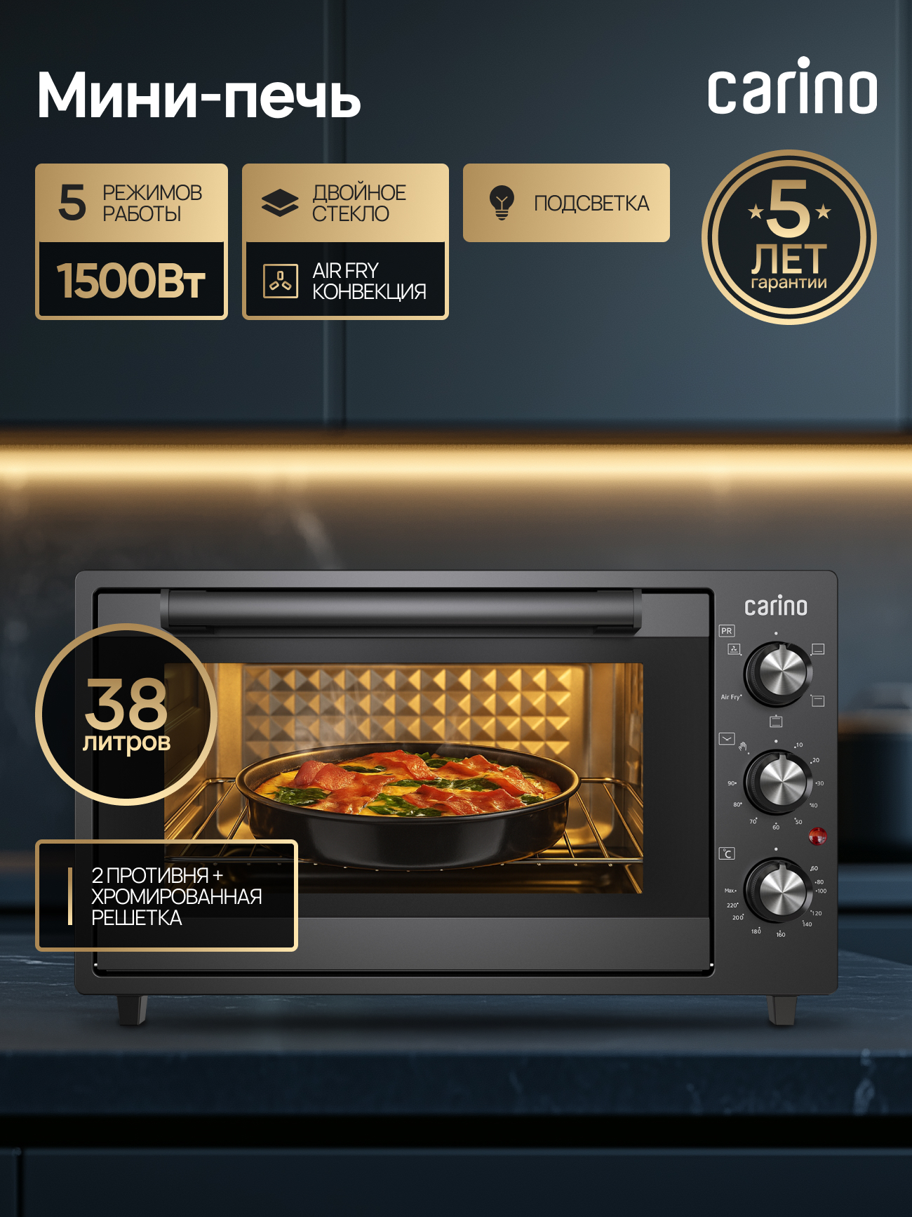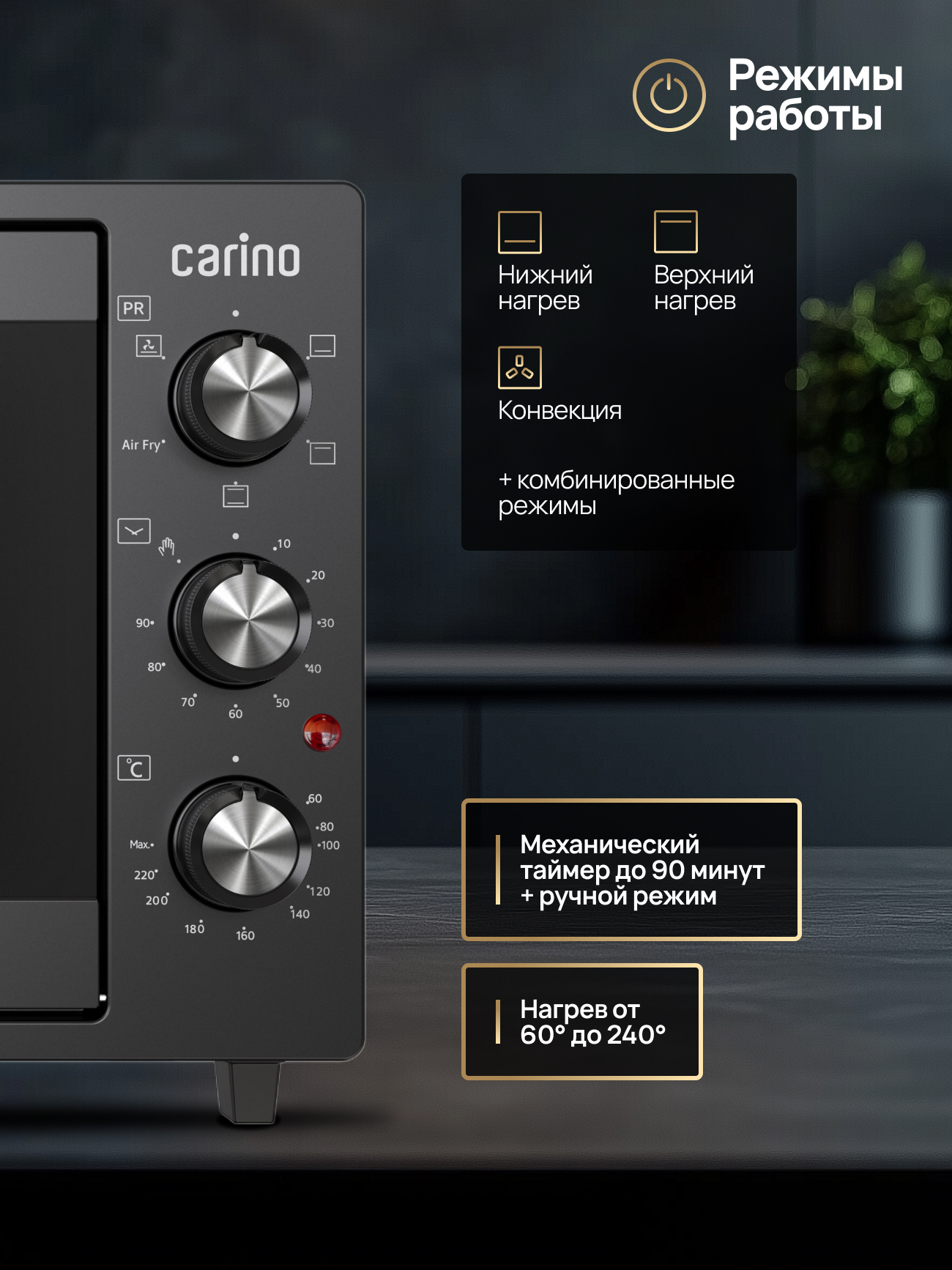 Верхний нагрев / Нижний нагрев / Верхний+нижний нагрев / Верхний + нижний нагрев + конвекция / Нижний нагрев+конвекция