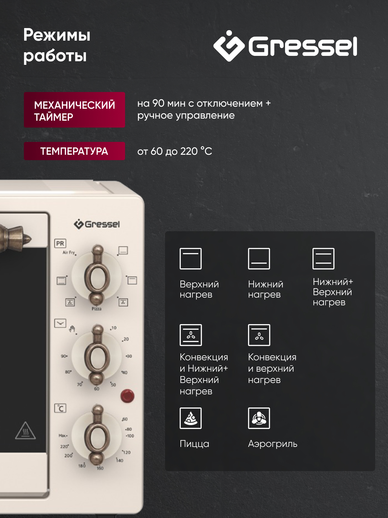 Верхний нагрев, Нижний нагрев, Нижний+Верхний нагрев, Верхний нагрев+Вентилятор,Нижний+Верхний нагрев+Вентилятор, Функция "Пицца" Функция "Аэрогриль
