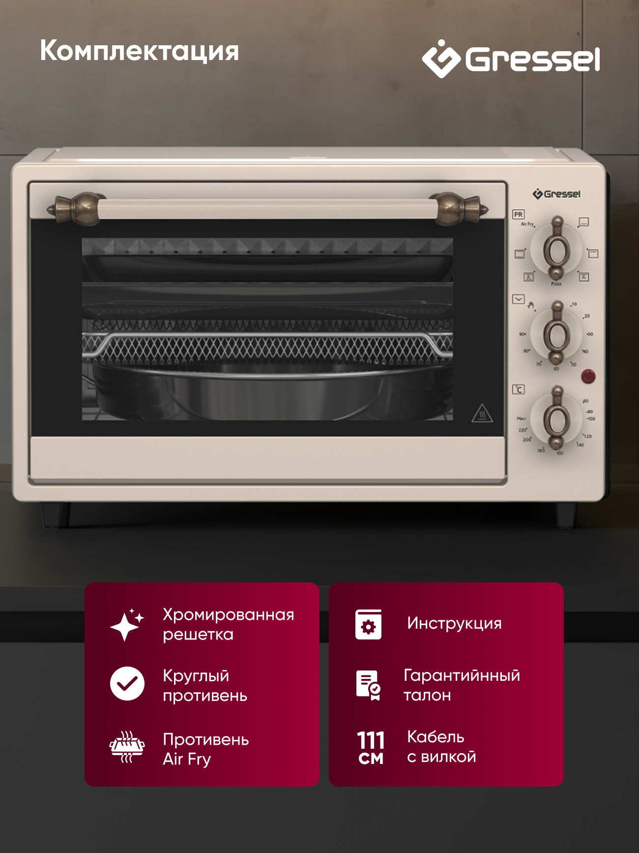 Мини-печь, инструкция, гарантийный талон, сертификат дополнительной гарантии, шнур питания, 1 круглый противень,1 стандартный квадратный противень, 1 решетка, 1 сетчатая корзина