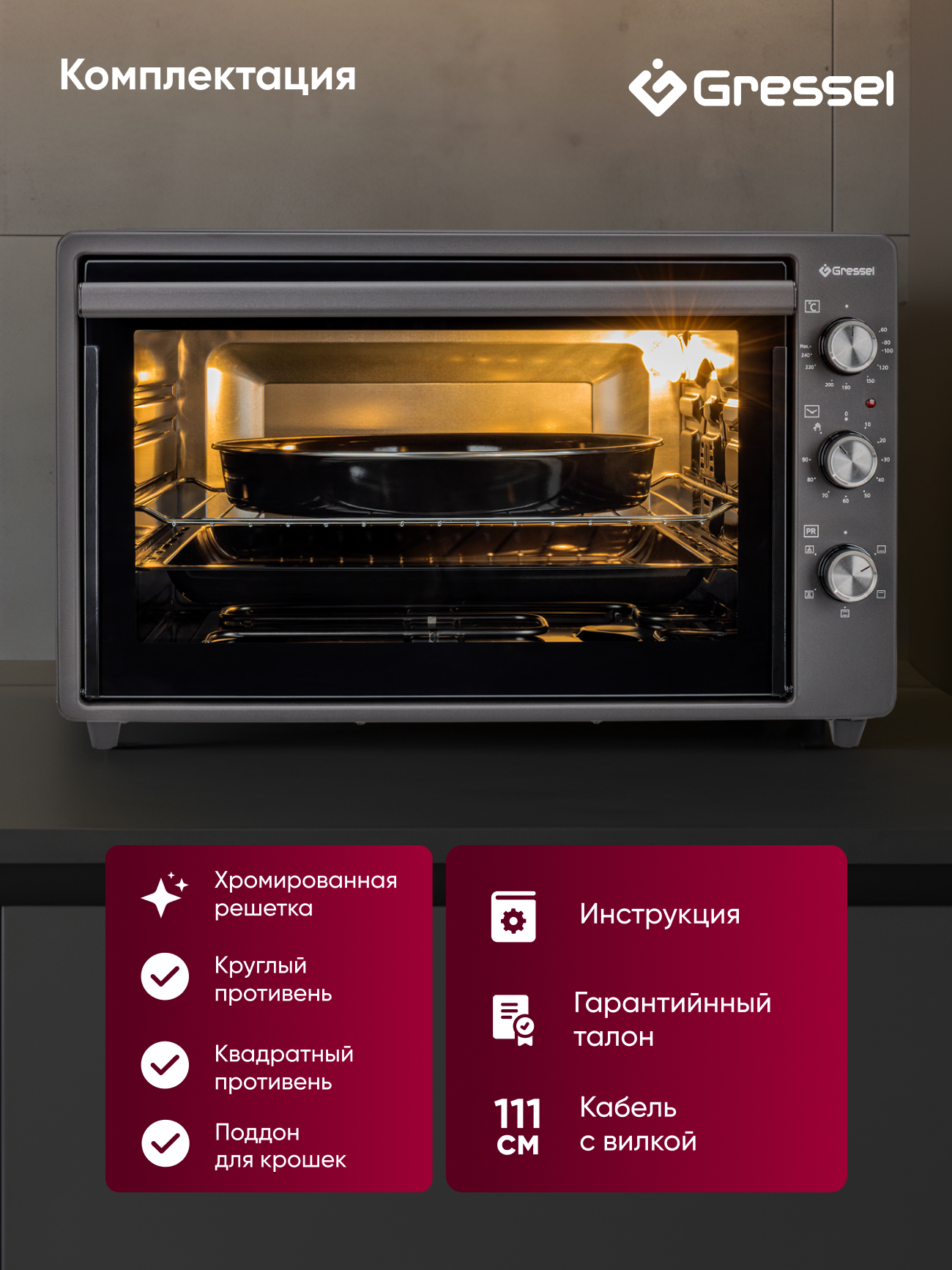 Мини-печь, инструкция, гарантийный талон, сертификат дополнительной гарантии, шнур питания, 1 круглый противень,1 стандартный квадратный противень, 1 решетка