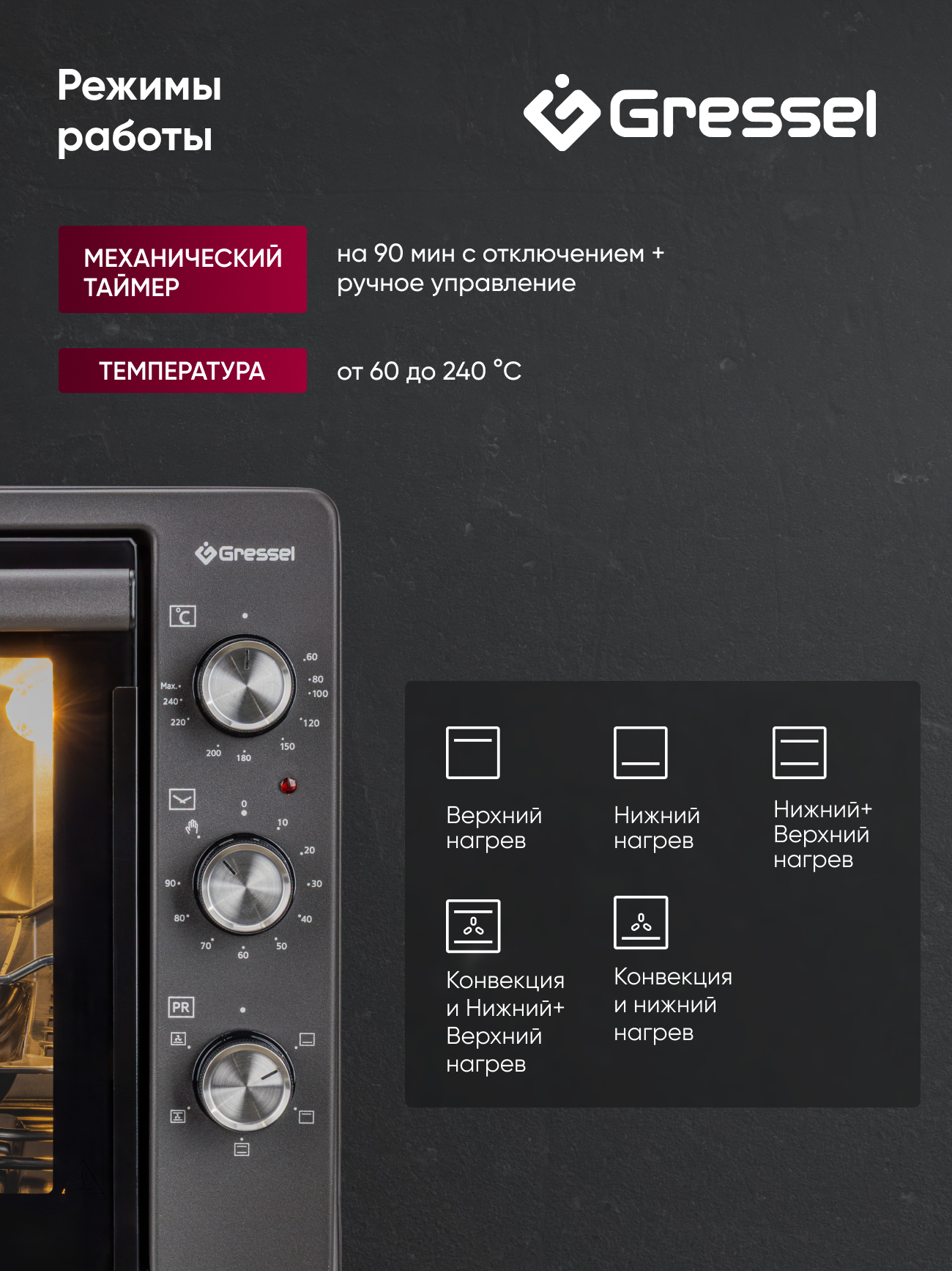 Верхний нагрев, Нижний нагрев, Нижний+Верхний нагрев, Нижний нагрев+Вентилятор, Нижний+Верхний нагрев+Вентилятор