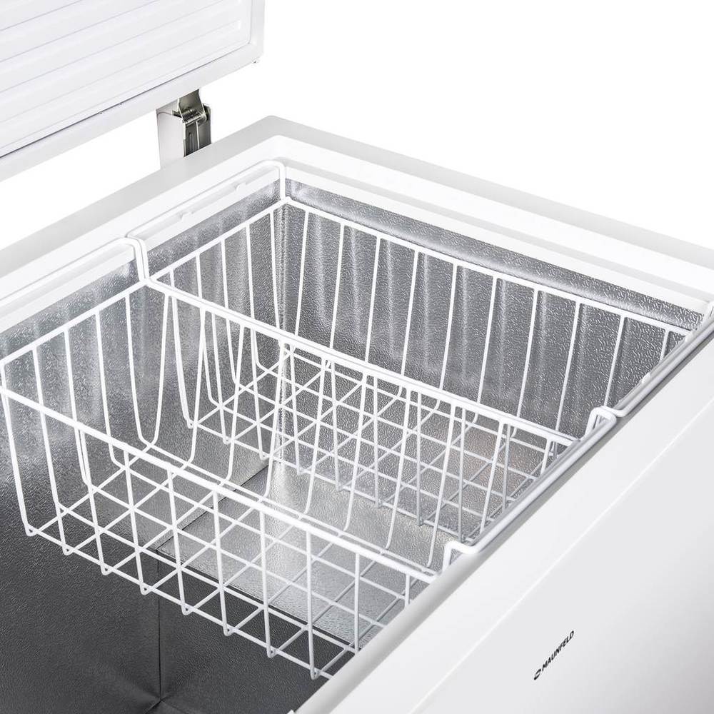 Внутренняя часть выполнена из антибактериального пластика легкой очистки. В комплекте идут две эргономичные сетчатые корзины для мелких продуктов и емкость для льда.