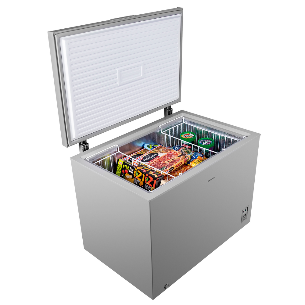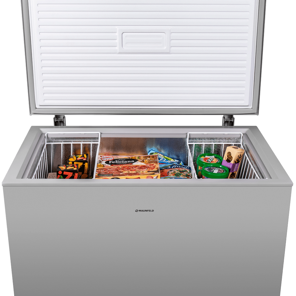 Отдельностоящий однокамерный морозильный ларь серого цвета имеет объем300 л и сделан из металла. Он позволит увеличить срок хранения ваших замороженных продуктов до 4-х месяцев.