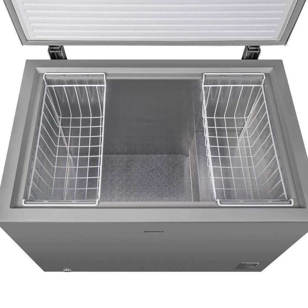 Внутренняя часть выполнена из антибактериального пластика легкой очистки. В комплекте идут две эргономичные сетчатые корзины для мелких продуктов и емкость для льда.