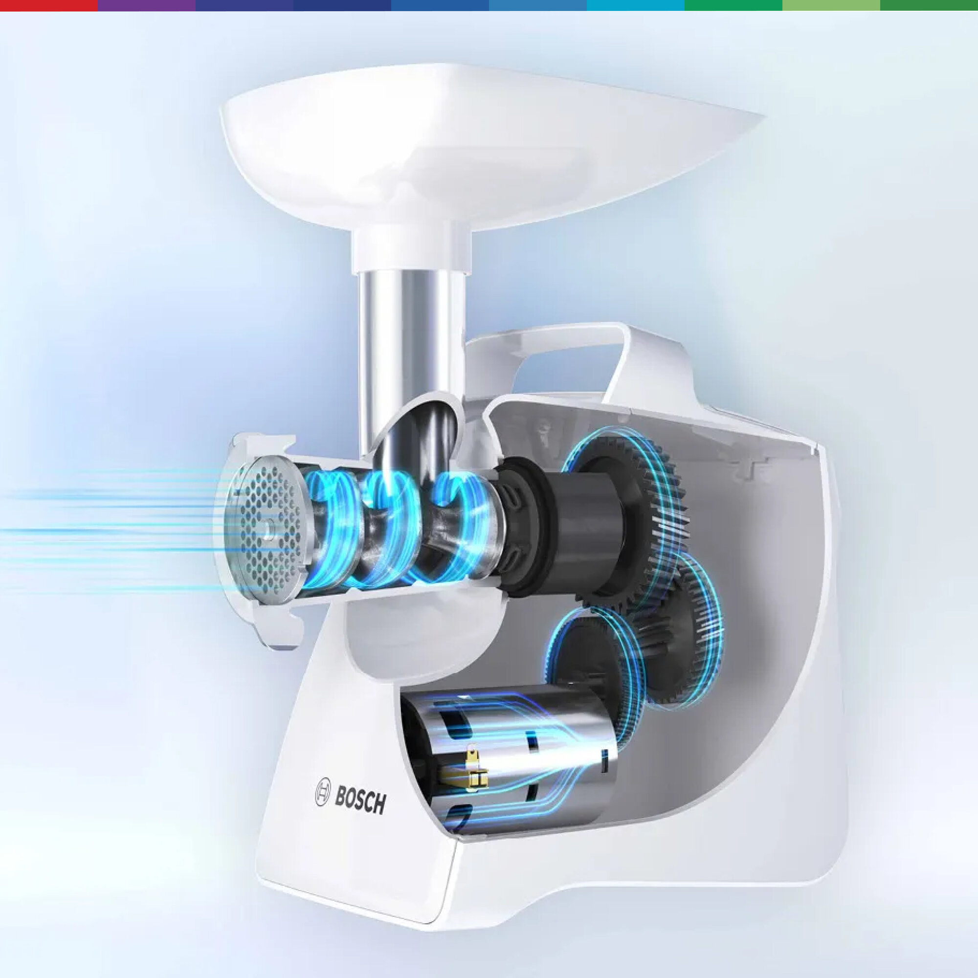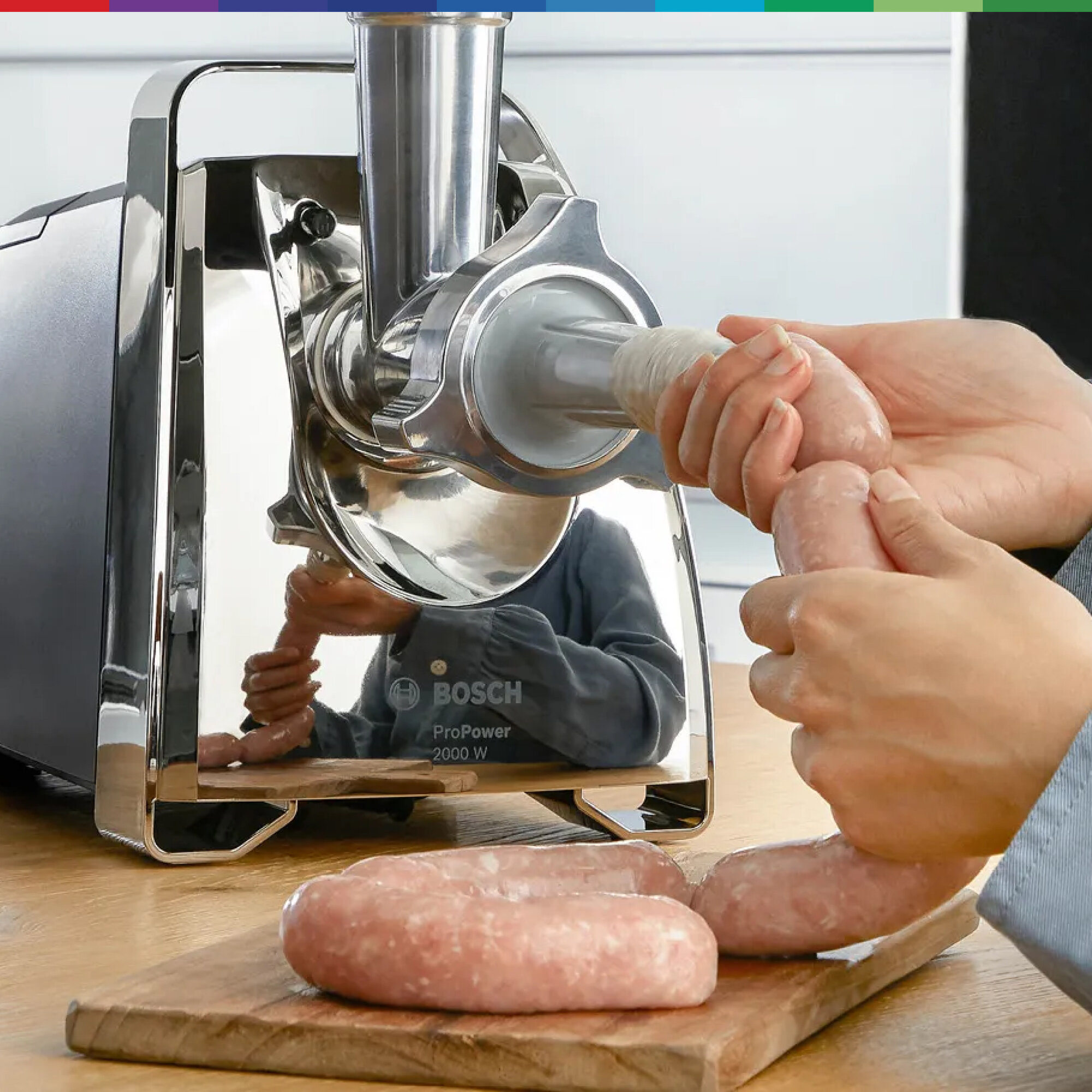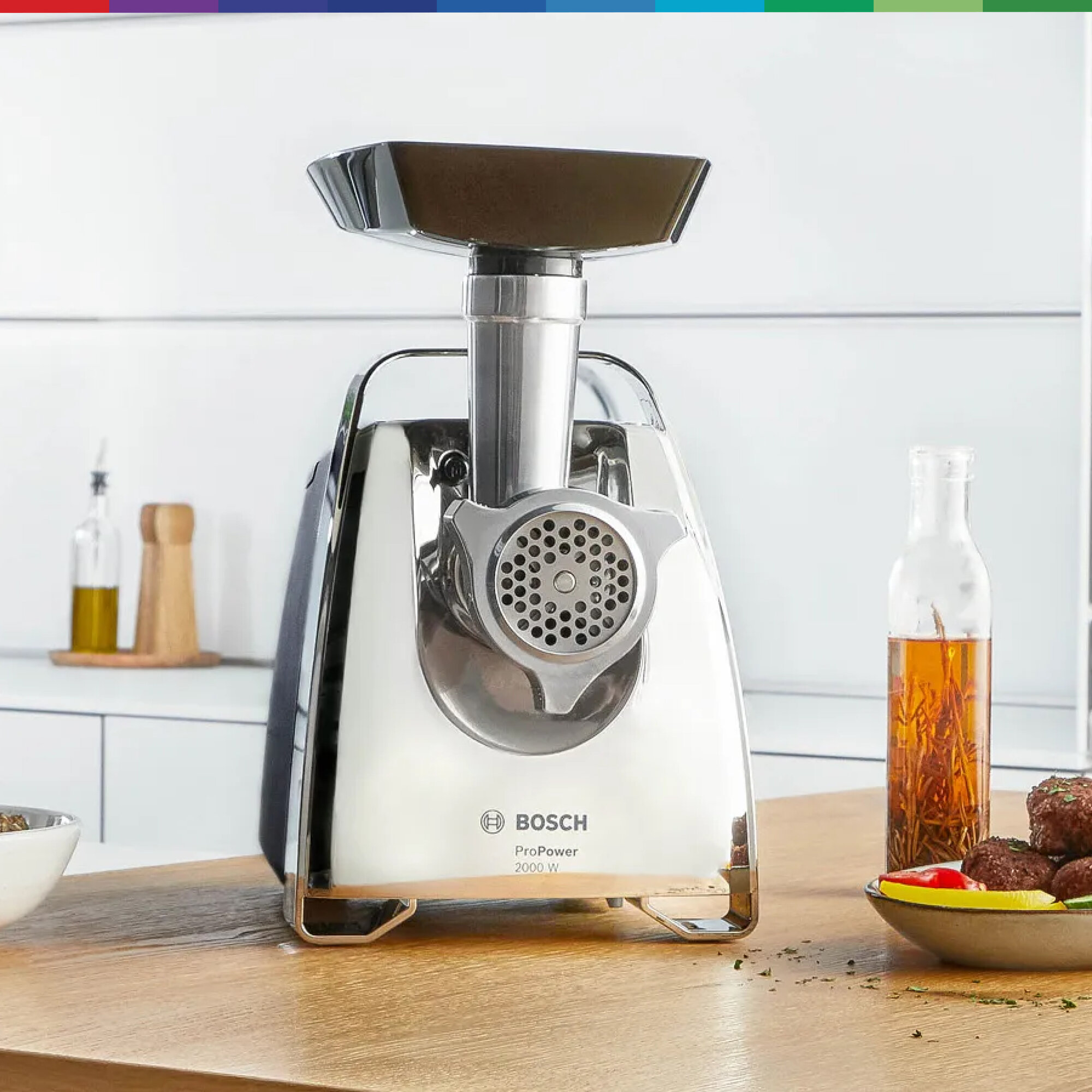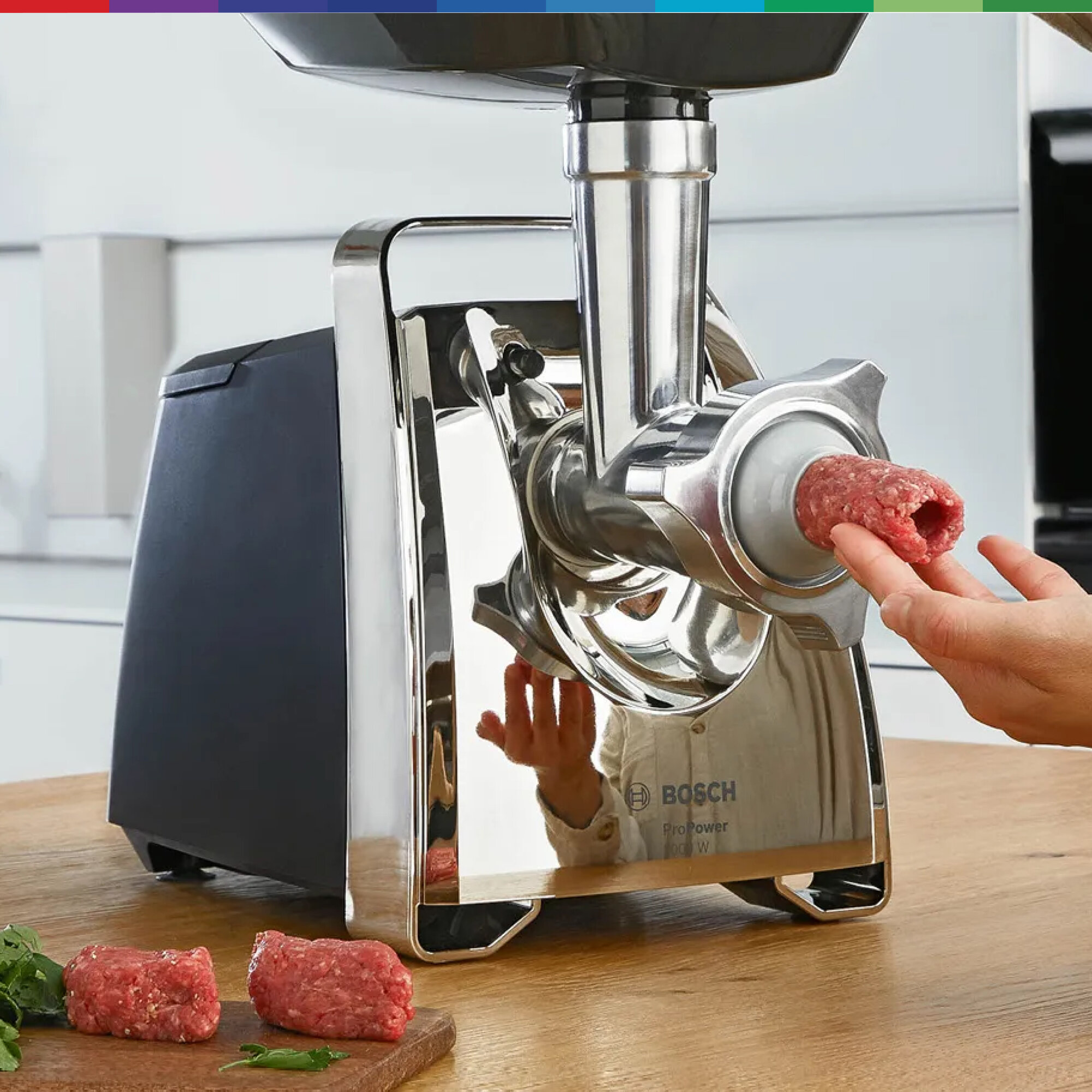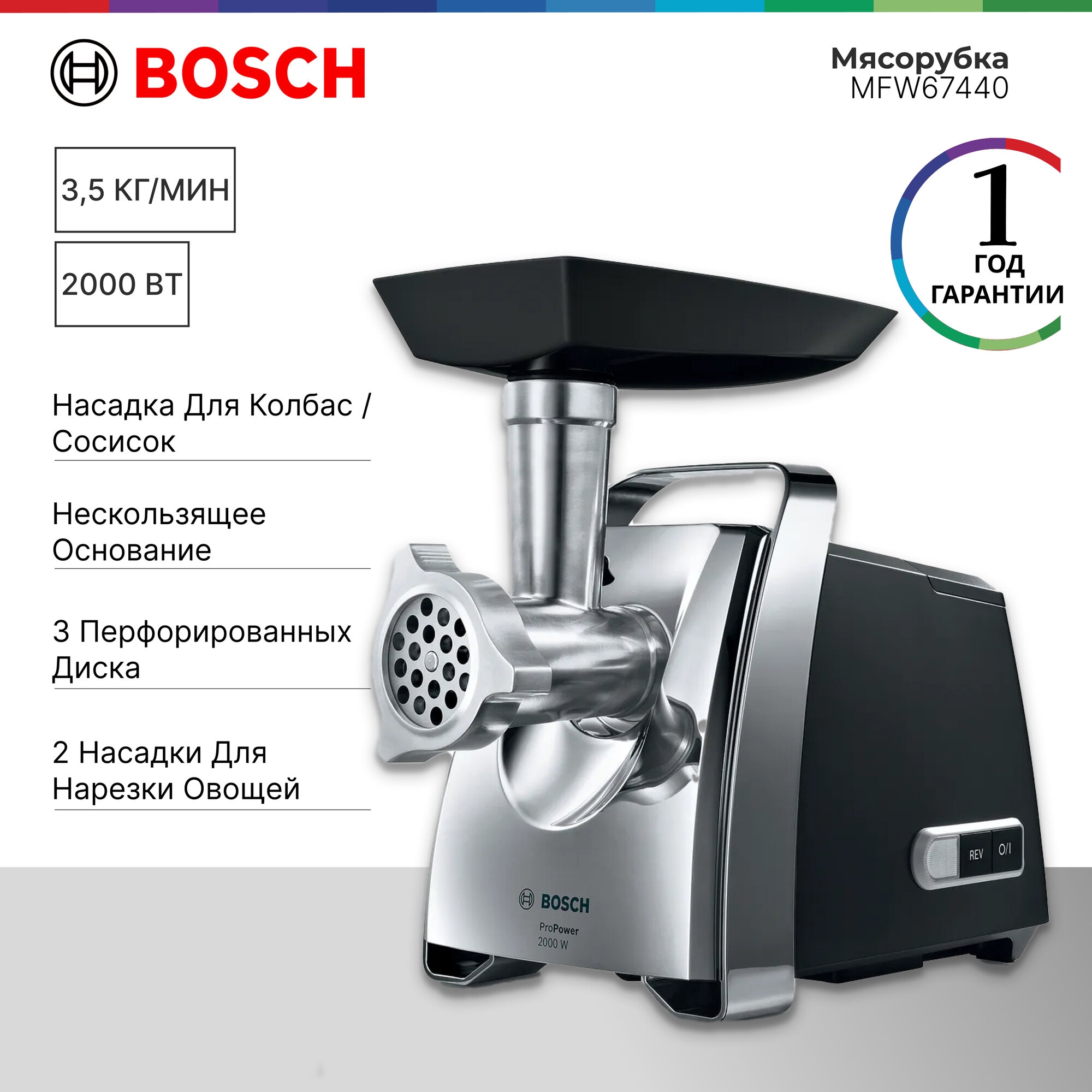 Электромясорубка Bosch ProPower MFW67440 не только переработает мясо в фарш, но и поможет вам в приготовлении других блюд. Мясорубка укомплектована насадками для кеббе, набивки домашних колбасок и барабанами для шинковки и резки овощей. За считаные минуты вы получите пережарку для супа или заготовки для салата. Высокая мощность мотора (700 Вт – номинальная, 2000 Вт – при блокировке) обеспечивает производительность 3,5 кг фарша в минуту. Это хорошее решение для тех, кто предпочитает заготавливать припасы впрок. Диски с отверстиями различного диаметра (3, 4,8 и 8 мм) позволят сделать и нежнейшие фрикадельки, например, для детского питания, и котлеты, и бифштексы. У прибора очень простое управление. Одна кнопка отвечает за включение и выключение, вторая – за активацию реверса – обратного хода. Если жилки и мясные волокна заблокируют шнек, вы сможете «отмотать» их обратно, не разбирая рабочую камеру. Система защиты от перегрева остановит работу и предотвратит поломку, если в рабочие механизмы попадёт косточка. Чтобы диски не потерялись и были под рукой в нужный момент, храните их в специальном отсеке, для каждого аксессуара есть отдельная ячейка. Сетевой шнур тоже «прячется» в корпусе, вы сможете отмотать ровно столько, сколько нужно, чтобы дотянуться до розетки, и провисающий кабель не будет вам мешать. Переставить мясорубку с места на место можно за удобную ручку.